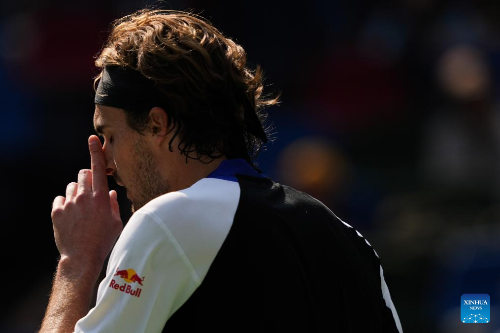 Stefanos Tsitsipas reacts during the men's singles round of 32 match between Stefanos Tsitsipas of Greece and Alexandre Muller of France at the ATP World Tour Shanghai Masters tennis tournament in Shanghai, east China, Oct. 8, 2024. (Xinhua/Xu Yanan)