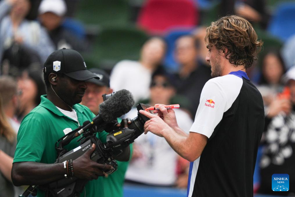 Stefanos Tsitsipas (R) signs an autograph on the camera after the men's singles round of 32 match between Stefanos Tsitsipas of Greece and Alexandre Muller of France at the ATP World Tour Shanghai Masters tennis tournament in Shanghai, east China, Oct. 8, 2024. (Xinhua/Xu Yanan)