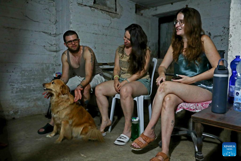 People take shelter in a protected room as the siren goes off at a building in Tel Aviv, Israel, on Oct. 7, 2024. Hezbollah fighters in Lebanon fired about five rockets at central Israel on Monday night, setting off sirens around Tel Aviv but causing no casualties, according to Israeli authorities. Local residents reported hearing explosions in the sky over central Israel. (Gideon Markowicz/JINI via Xinhua)