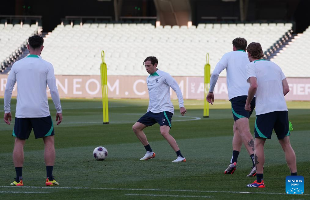 Craig Goodwin (C) of Team Australia attends a training session prior to the 2026 FIFA World Cup Asian qualifiers match between China and Australia in Canberra, Australia, on Oct. 9, 2024. (Photo by Xie Sida/Xinhua)