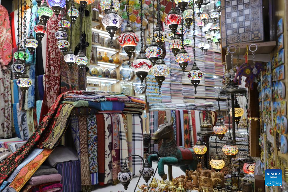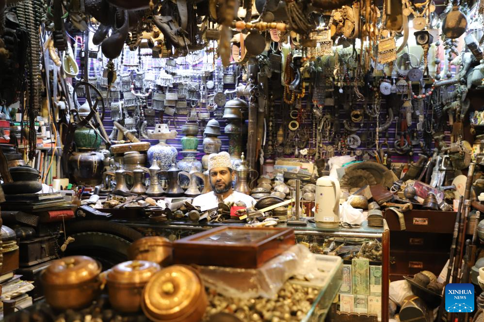 Products are displayed at a shop in the Mutrah Souq market in Muscat, Oman, Oct. 8, 2024. Mutrah Souq, located along the waterfront of Muscat, is a traditional Arab market. Shops here offer artifacts, antiques, textiles and jewelry, making the market one of the most well known tourist attractions in Muscat. (Xinhua/Wang Qiang)