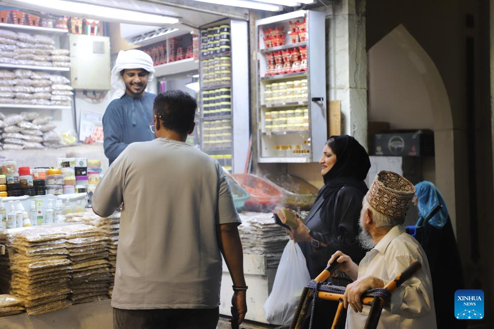 Customers buy goods at a shop in the Mutrah Souq market in Muscat, Oman, Oct. 8, 2024. Mutrah Souq, located along the waterfront of Muscat, is a traditional Arab market. Shops here offer artifacts, antiques, textiles and jewelry, making the market one of the most well known tourist attractions in Muscat. (Xinhua/Wang Qiang)