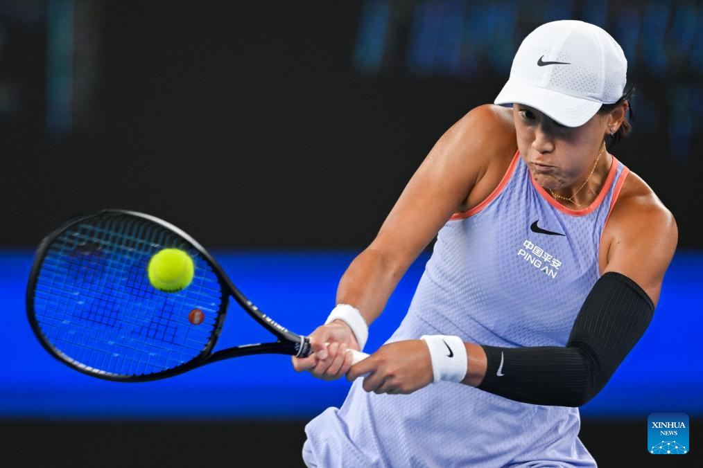 Wang Xiyu of China hits a return during the women's singles round of 64 match against Andreeva Mirra of Russia at the 2024 Wuhan Open tennis tournament in Wuhan, capital of central China's Hubei Province, Oct. 8, 2024. (Xinhua/Du Zixuan)