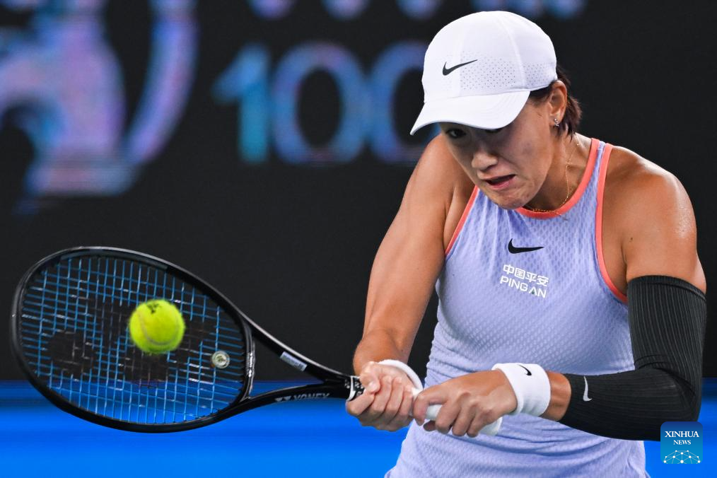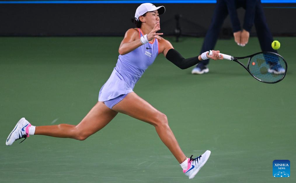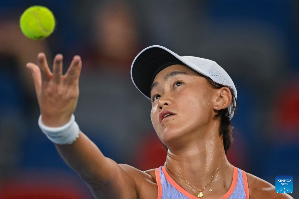 Wang Xiyu of China hits a return during the women's singles round of 64 match against Andreeva Mirra of Russia at the 2024 Wuhan Open tennis tournament in Wuhan, capital of central China's Hubei Province, Oct. 8, 2024. (Xinhua/Wu Zhizun)
