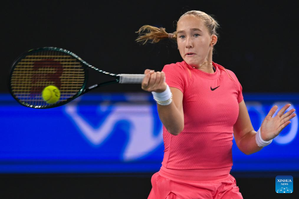 Andreeva Mirra of Russia hits a return during the women's singles round of 64 match against Wang Xiyu of China at the 2024 Wuhan Open tennis tournament in Wuhan, capital of central China's Hubei Province, Oct. 8, 2024. (Xinhua/Wu Zhizun)