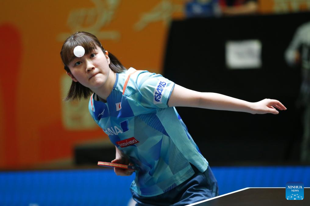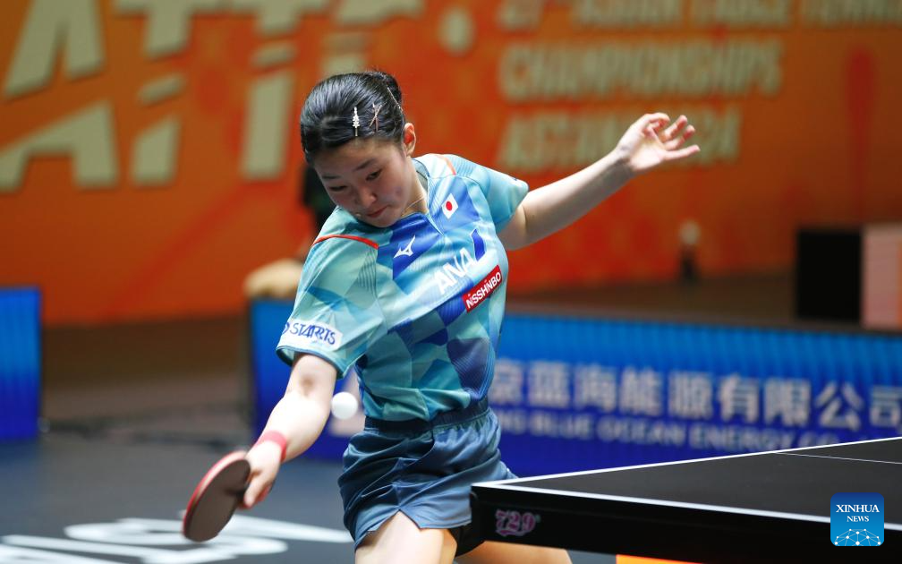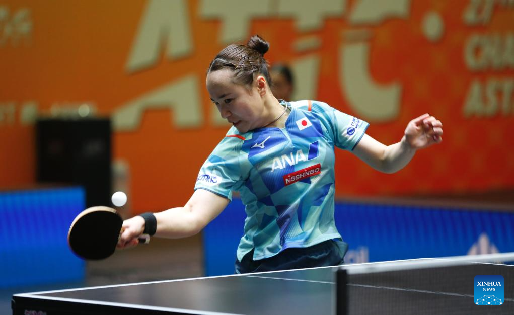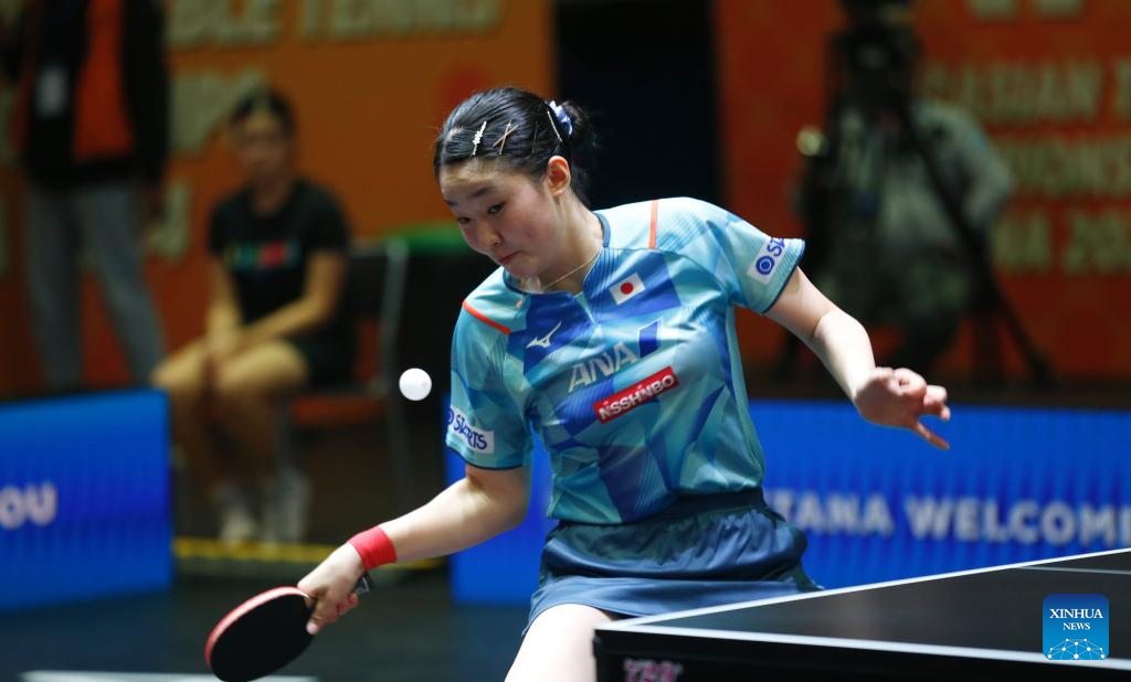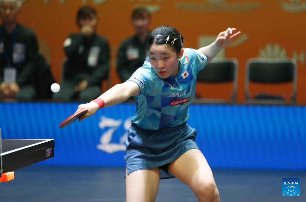 Miwa Harimoto of Japan hits a return to Manika Batra of India during the women's teams semifinals match between Japan and India at the 27th ITTF-Asian Table Tennis Championships in Astana, Kazakhstan, Oct. 9, 2024. (Photo by Kalizhan Ospanov/Xinhua)