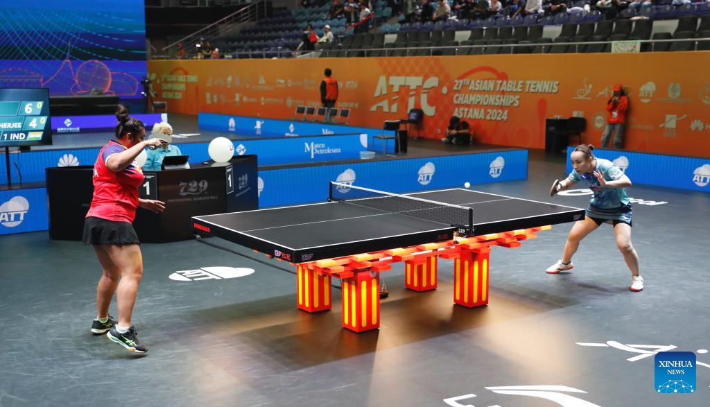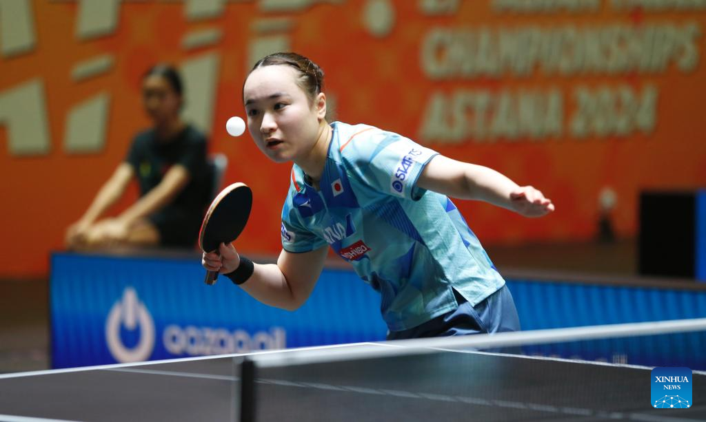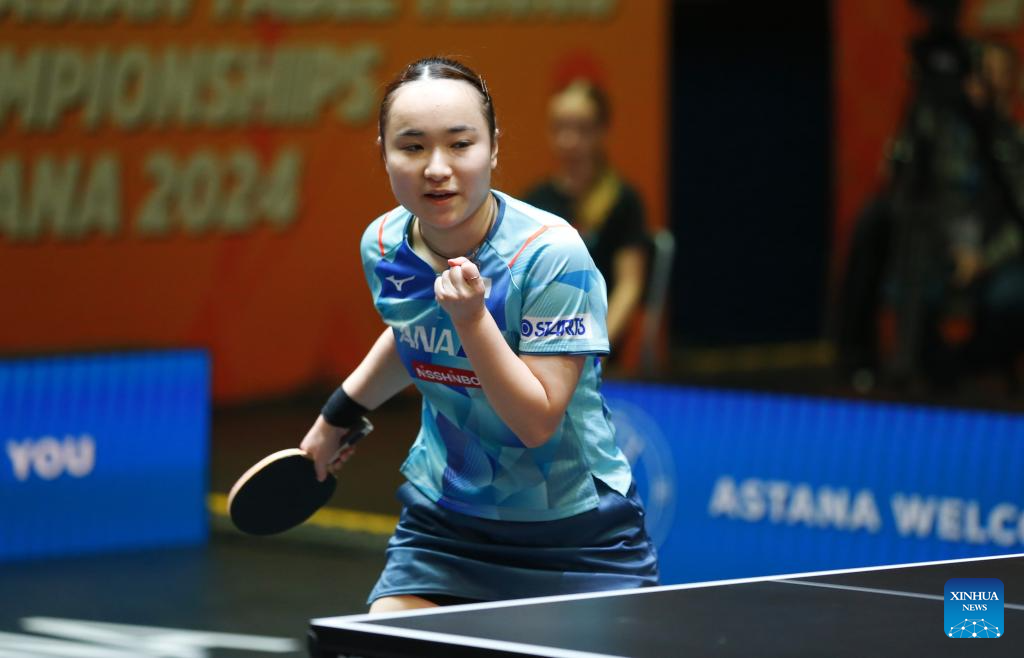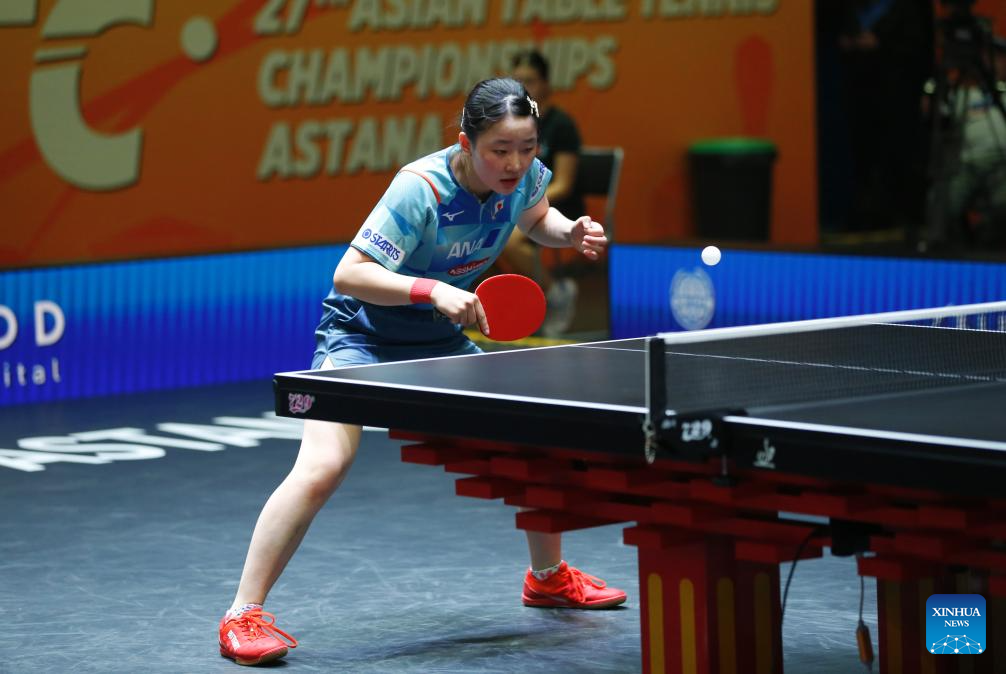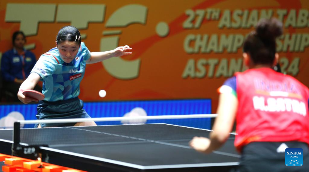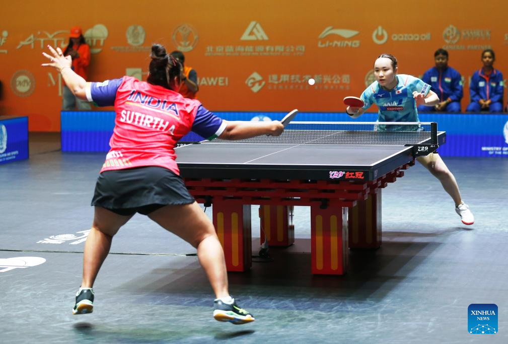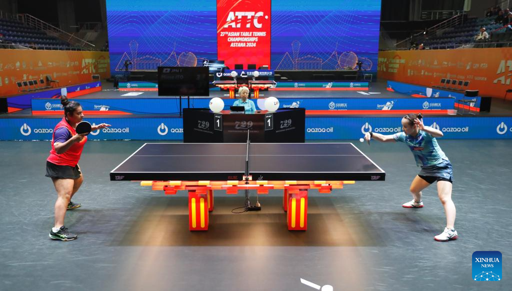 Ito Mima (R) of Japan competes against Sutirtha Mukherjee of India during the women's teams semifinals match 2 between Japan and India at the 27th ITTF-Asian Table Tennis Championships in Astana, Kazakhstan, Oct. 9, 2024. (Photo by Kalizhan Ospanov/Xinhua)