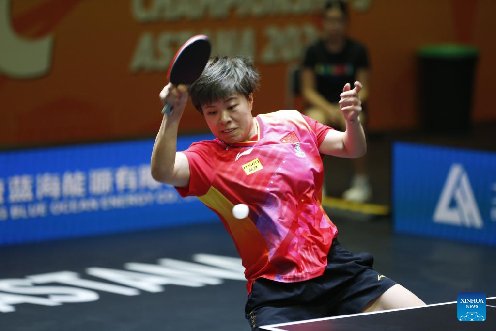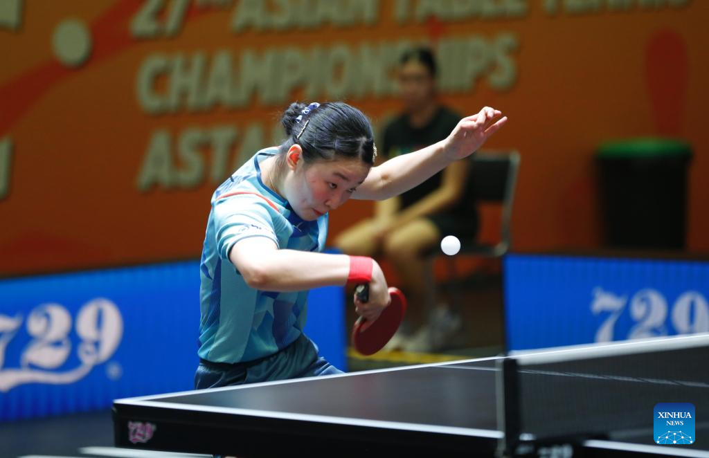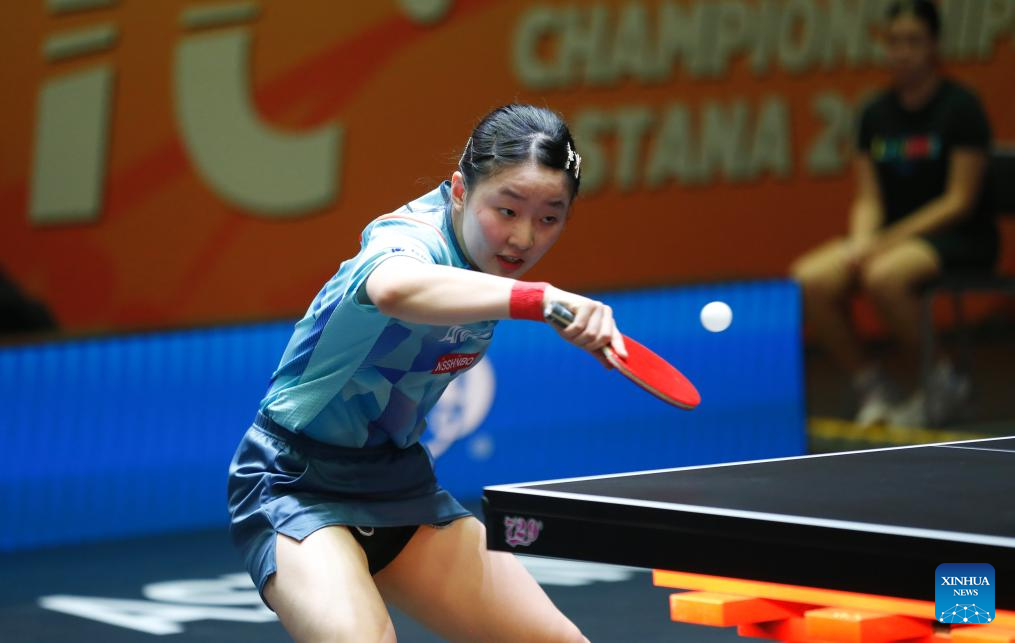 Wang Yidi of China hits a return to Zhu Chengzhu of China's Hong Kong during the women's team semifinal between China and China's Hong Kong at the 27th ITTF-Asian Table Tennis Championships in Astana, Kazakhstan, Oct. 9, 2024. (Photo by Kalizhan Ospanov/Xinhua)