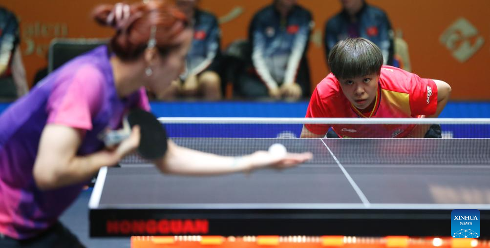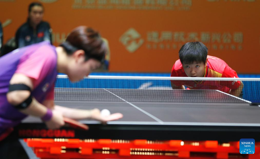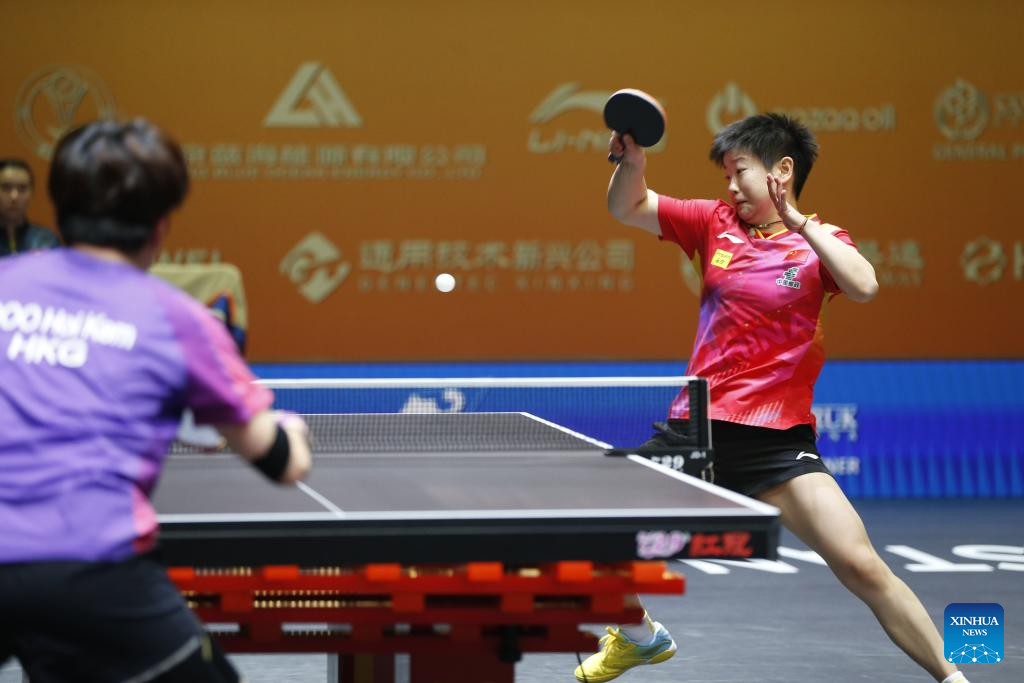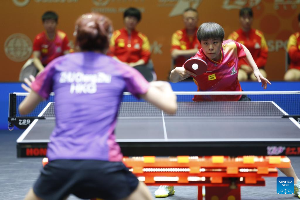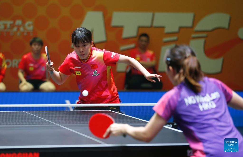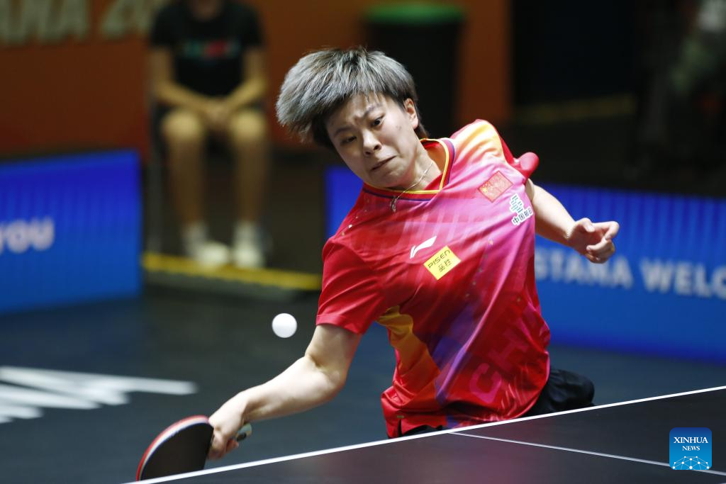 Ng Wing Lam (L) of China's Hong Kong competes against Chen Xingtong of China during the women's team semifinal between China and China's Hong Kong at the 27th ITTF-Asian Table Tennis Championships in Astana, Kazakhstan, Oct. 9, 2024. (Photo by Kalizhan Ospanov/Xinhua)
