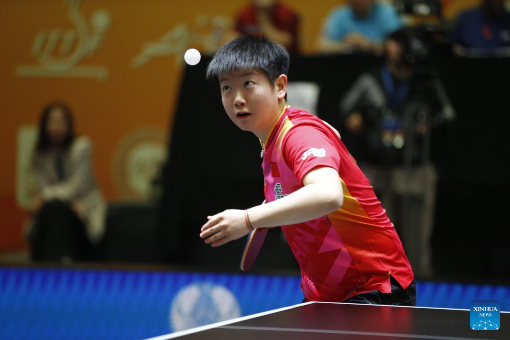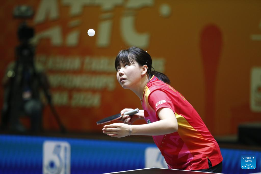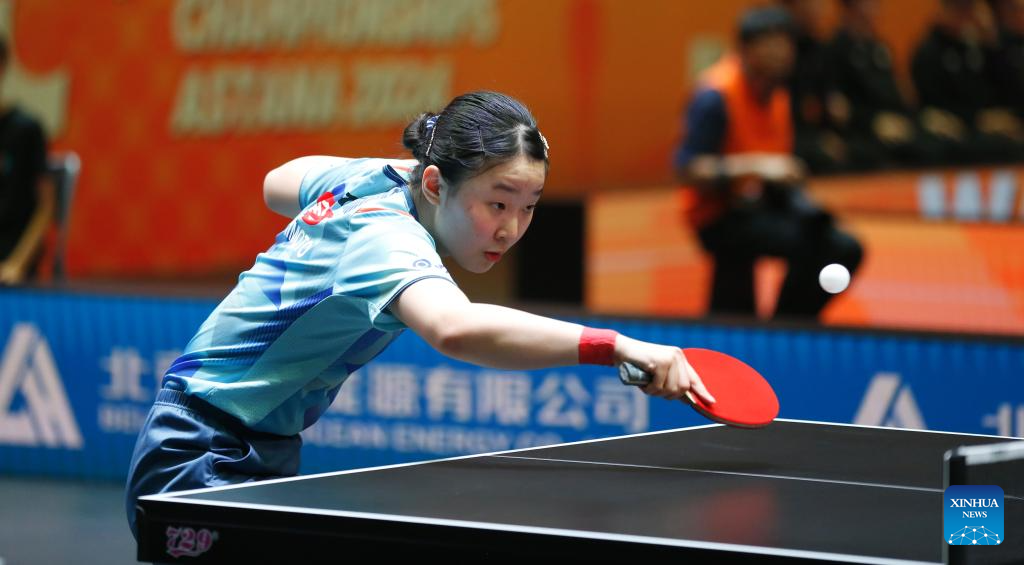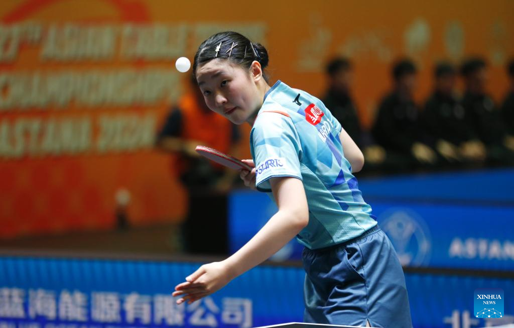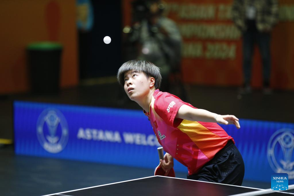 Chen Xingtong of China serves to Ng Wing Lam of China's Hong Kong during the women's team semifinal between China and China's Hong Kong at the 27th ITTF-Asian Table Tennis Championships in Astana, Kazakhstan, Oct. 9, 2024. (Photo by Kalizhan Ospanov/Xinhua)