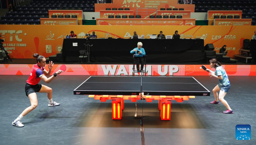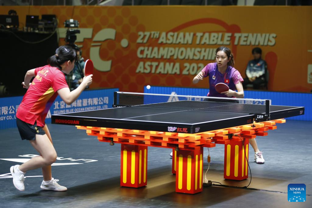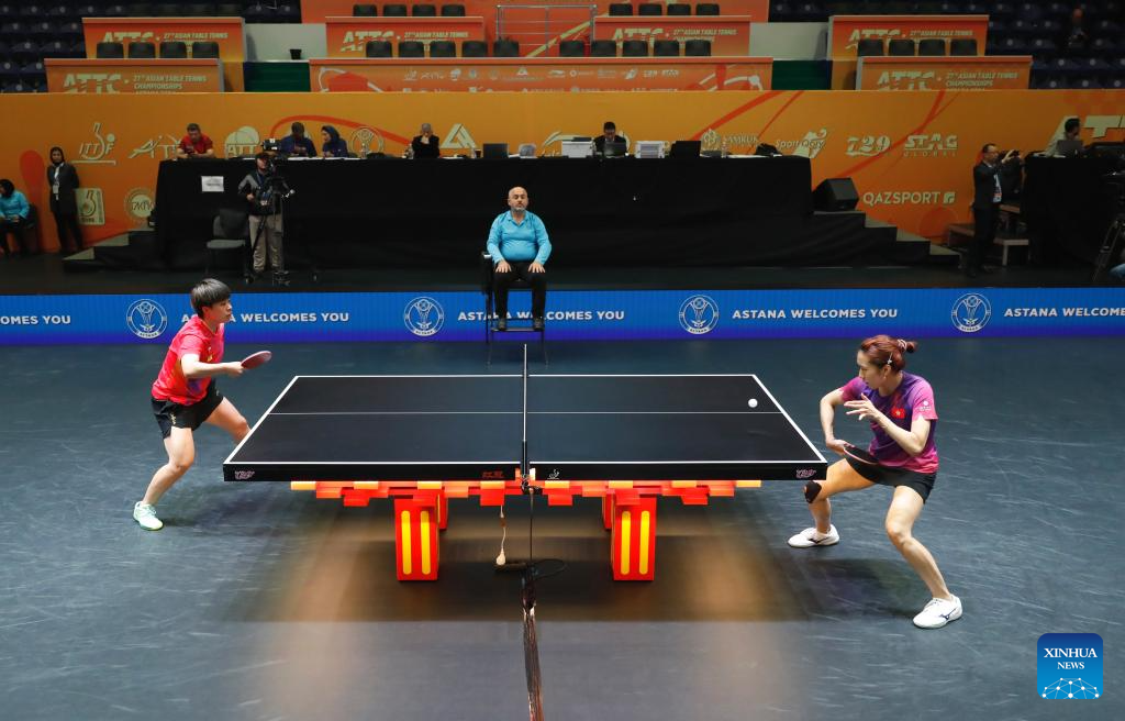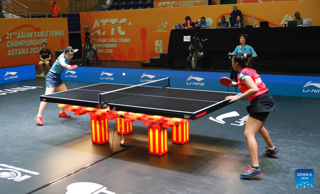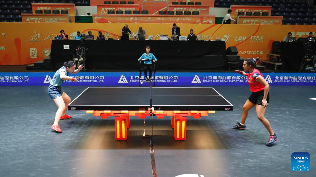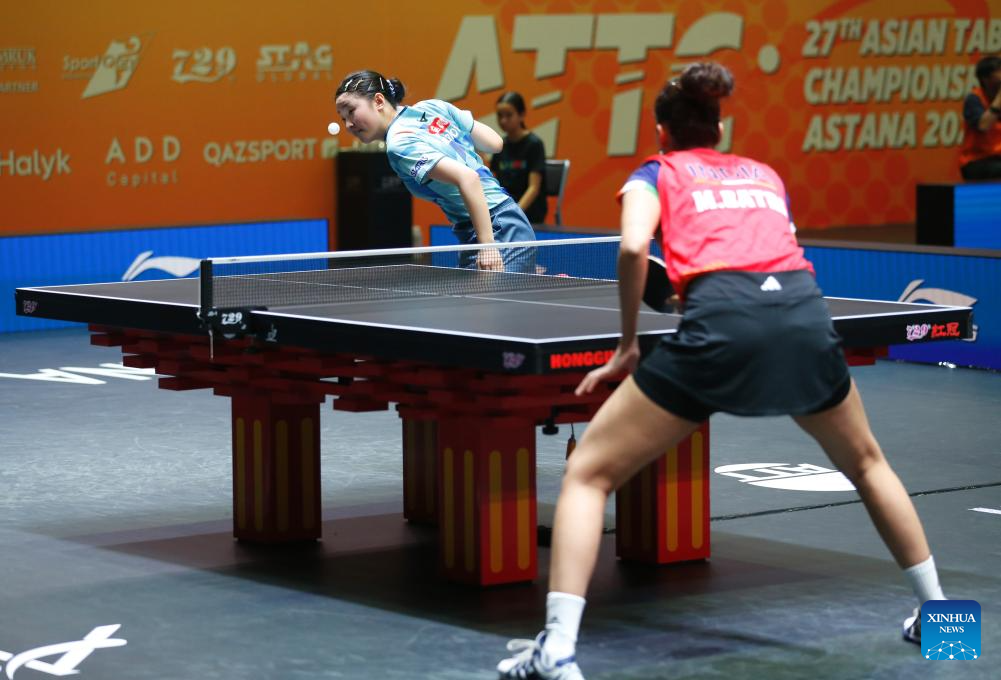 Wang Yidi (R) of China hits a return to Zhu Chengzhu of China's Hong Kong during the women's team semifinal between China and China's Hong Kong at the 27th ITTF-Asian Table Tennis Championships in Astana, Kazakhstan, Oct. 9, 2024. (Photo by Kalizhan Ospanov/Xinhua)