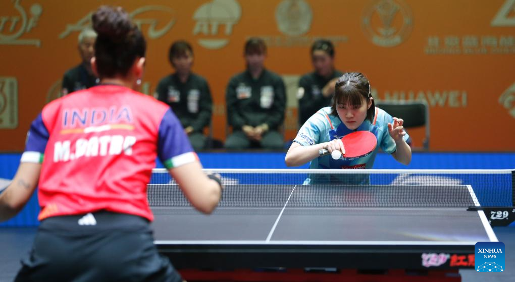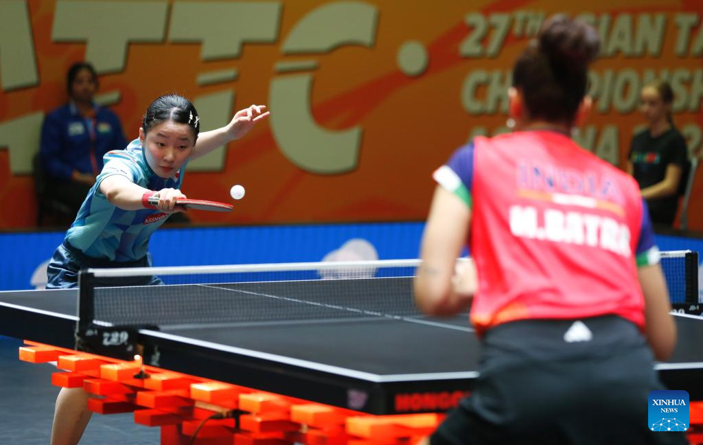 Miwa Harimoto (L) of Japan competes against Manika Batra of India during the women's teams semifinals match between Japan and India at the 27th ITTF-Asian Table Tennis Championships in Astana, Kazakhstan, Oct. 9, 2024. (Photo by Kalizhan Ospanov/Xinhua)