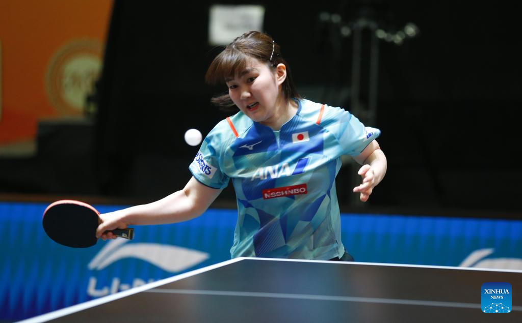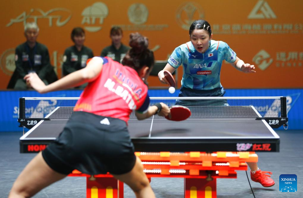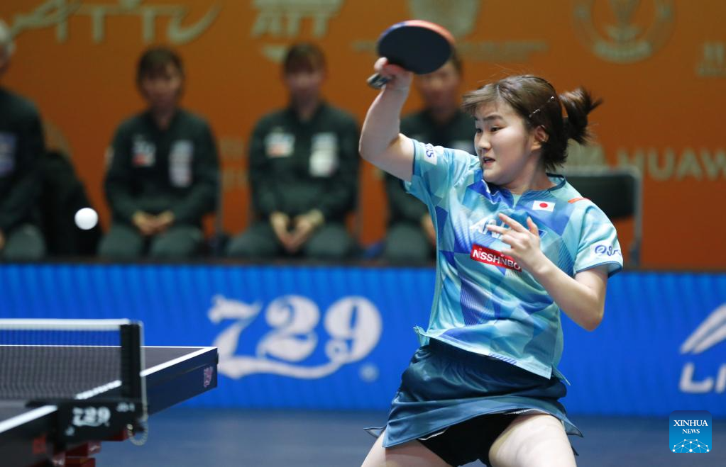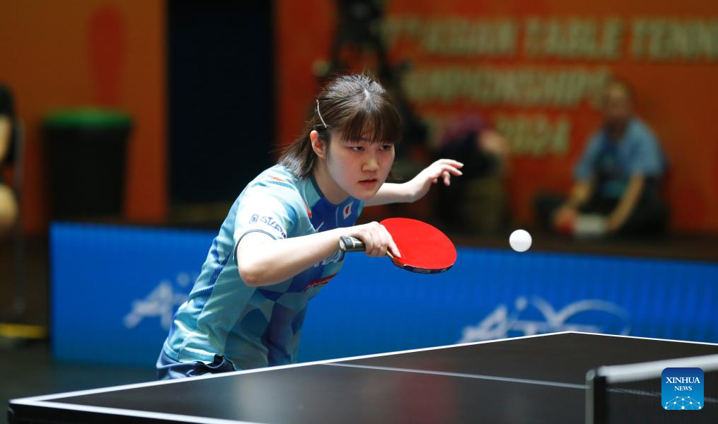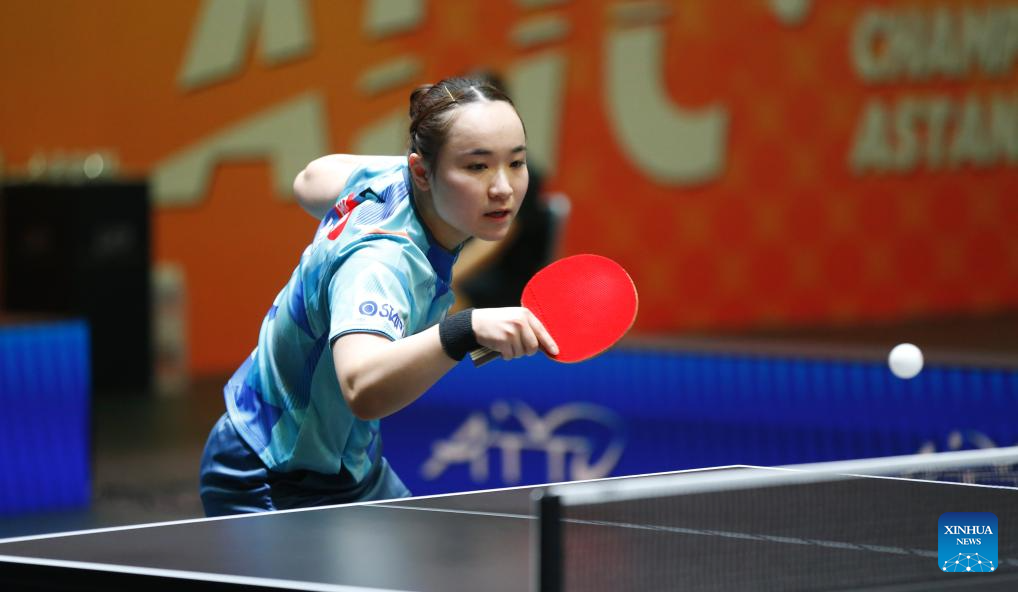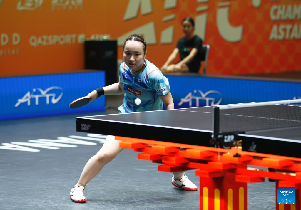 Ito Mima of Japan hits a return to Sutirtha Mukherjee of India during the women's teams semifinals match 2 between Japan and India at the 27th ITTF-Asian Table Tennis Championships in Astana, Kazakhstan, Oct. 9, 2024. (Photo by Kalizhan Ospanov/Xinhua)