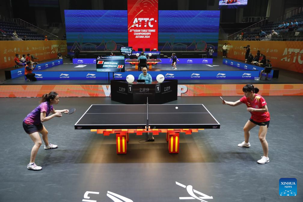 Chen Xingtong (L) of China hits a return to Ng Wing Lam of China's Hong Kong during the women's team semifinal between China and China's Hong Kong at the 27th ITTF-Asian Table Tennis Championships in Astana, Kazakhstan, Oct. 9, 2024. (Photo by Kalizhan Ospanov/Xinhua)