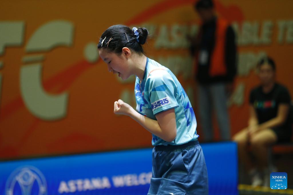 Harimoto Miwa of Japan celebrates during the women's teams semifinals match 2 between India and Japan at the 27th ITTF-Asian Table Tennis Championships in Astana, Kazakhstan, Oct. 9, 2024. (Photo by Kalizhan Ospanov/Xinhua)