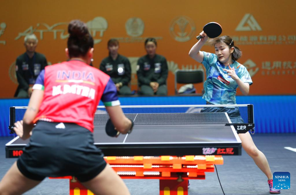 Miwa Harimoto (R) of Japan competes against Manika Batra of India during the women's teams semifinals match between Japan and India at the 27th ITTF-Asian Table Tennis Championships in Astana, Kazakhstan, Oct. 9, 2024. (Photo by Kalizhan Ospanov/Xinhua)
