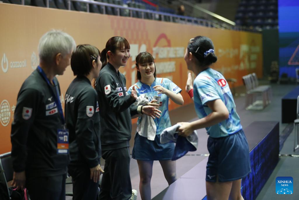 Ito Mima of Japan celebrates during the women's teams semifinals match 2 between Japan and India at the 27th ITTF-Asian Table Tennis Championships in Astana, Kazakhstan, Oct. 9, 2024. (Photo by Kalizhan Ospanov/Xinhua)
