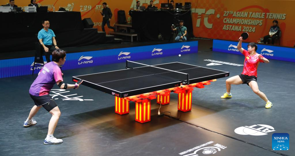 Sun Yingsha (R) of China competes against Doo Hoi Kem of China's Hong Kong during the women's team semifinal between China and China's Hong Kong at the 27th ITTF-Asian Table Tennis Championships in Astana, Kazakhstan, Oct. 9, 2024. (Photo by Kalizhan Ospanov/Xinhua)