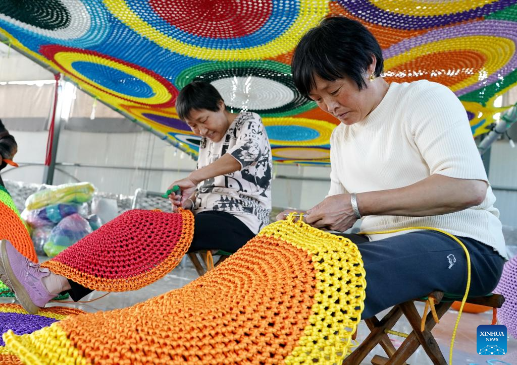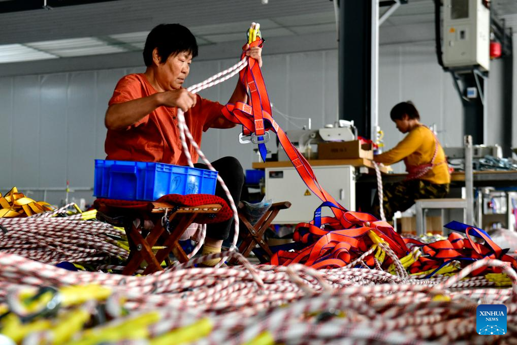 People work at a workshop of a net and rope enterprise in Huimin County, east China's Shandong Province, Oct. 8, 2024.