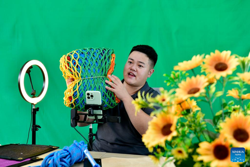 A man sells net and rope products via livestreaming in Huimin County, east China's Shandong Province, Oct. 8, 2024.