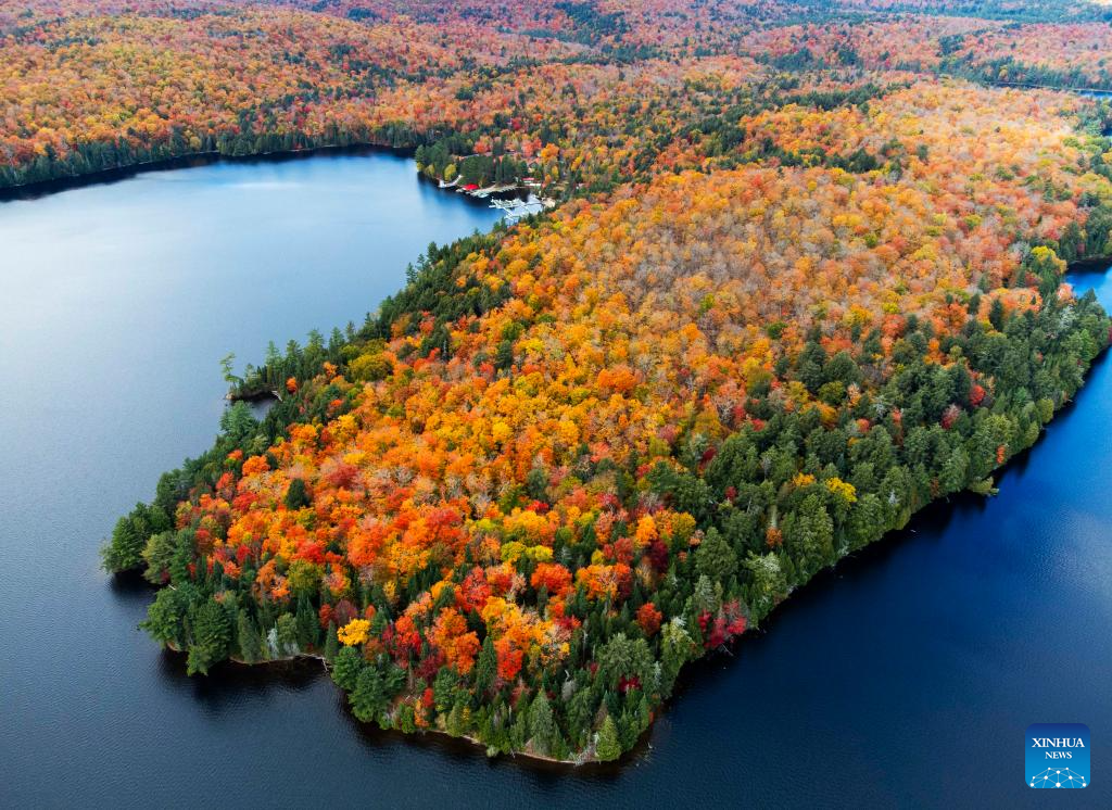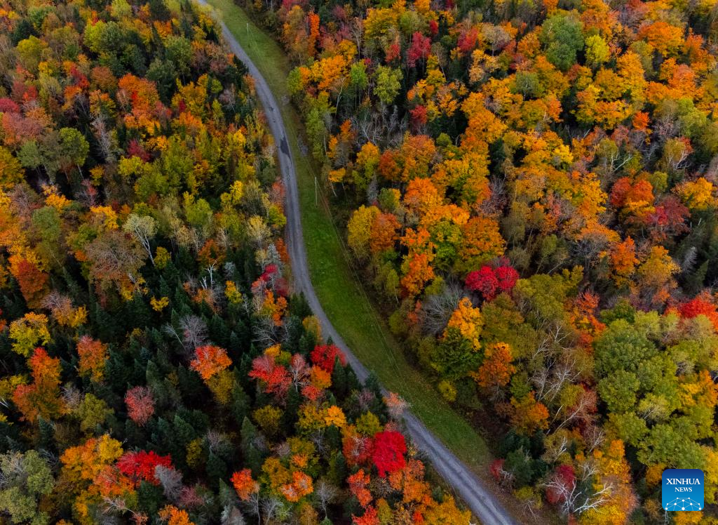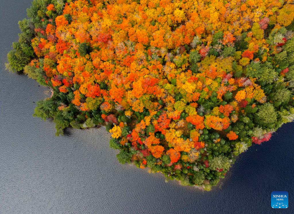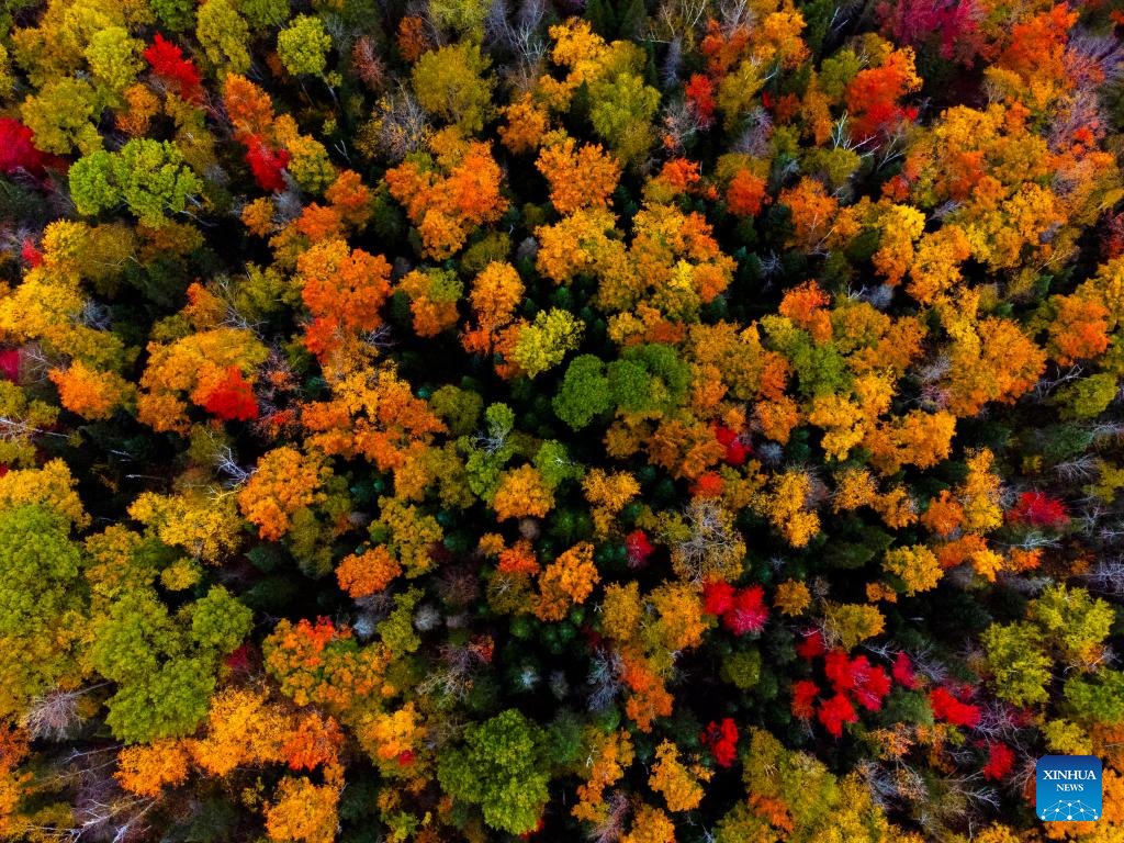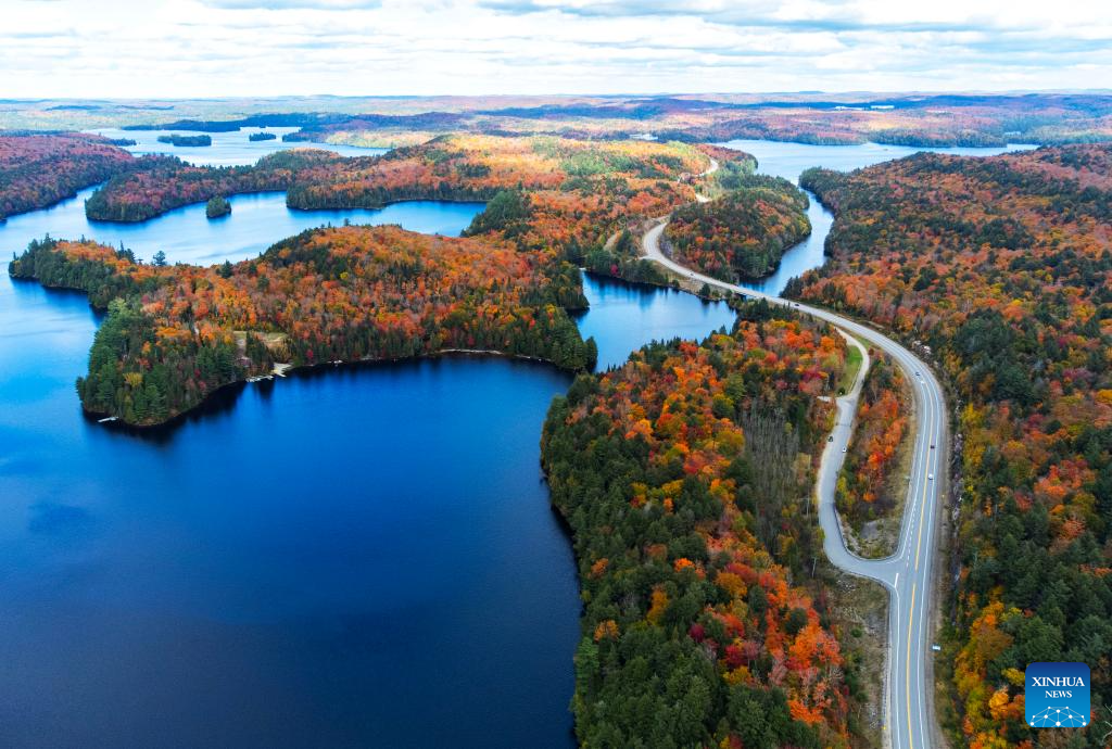 An aerial drone photo taken on Oct. 8, 2024 shows the autumn scenery near Highway 60 in Ontario, Canada. (Photo by Zou Zheng/Xinhua)