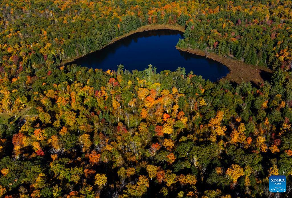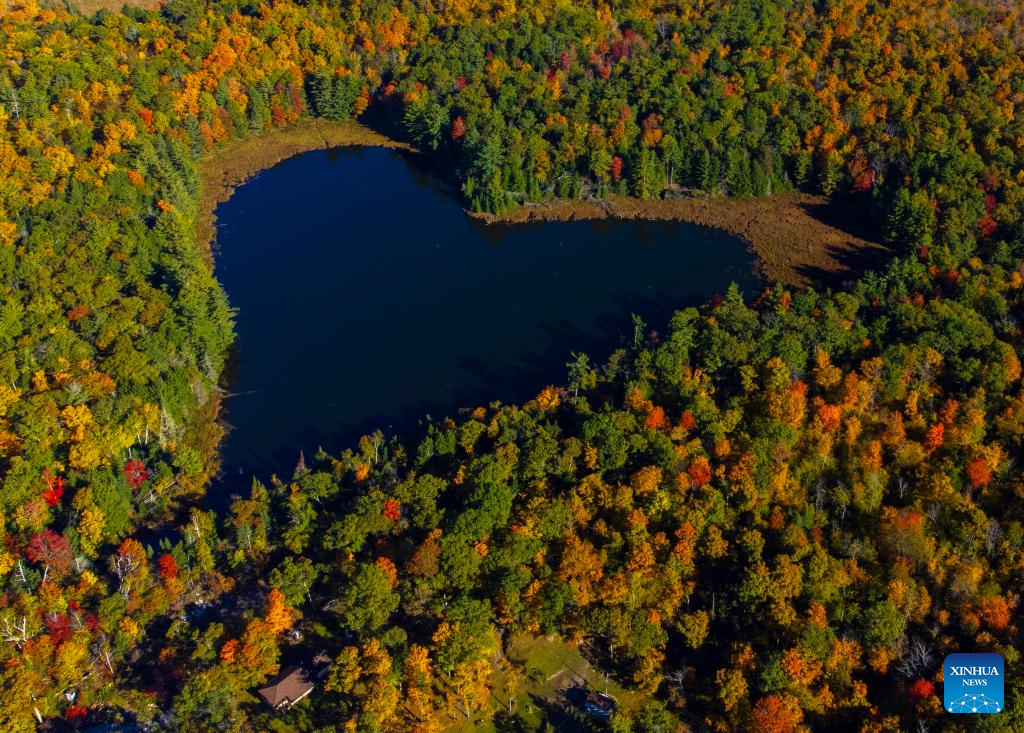 An aerial drone photo taken on Oct. 8, 2024 shows the autumn scenery of a heart-shaped lake in North Frontenac, Ontario, Canada. (Photo by Zou Zheng/Xinhua)