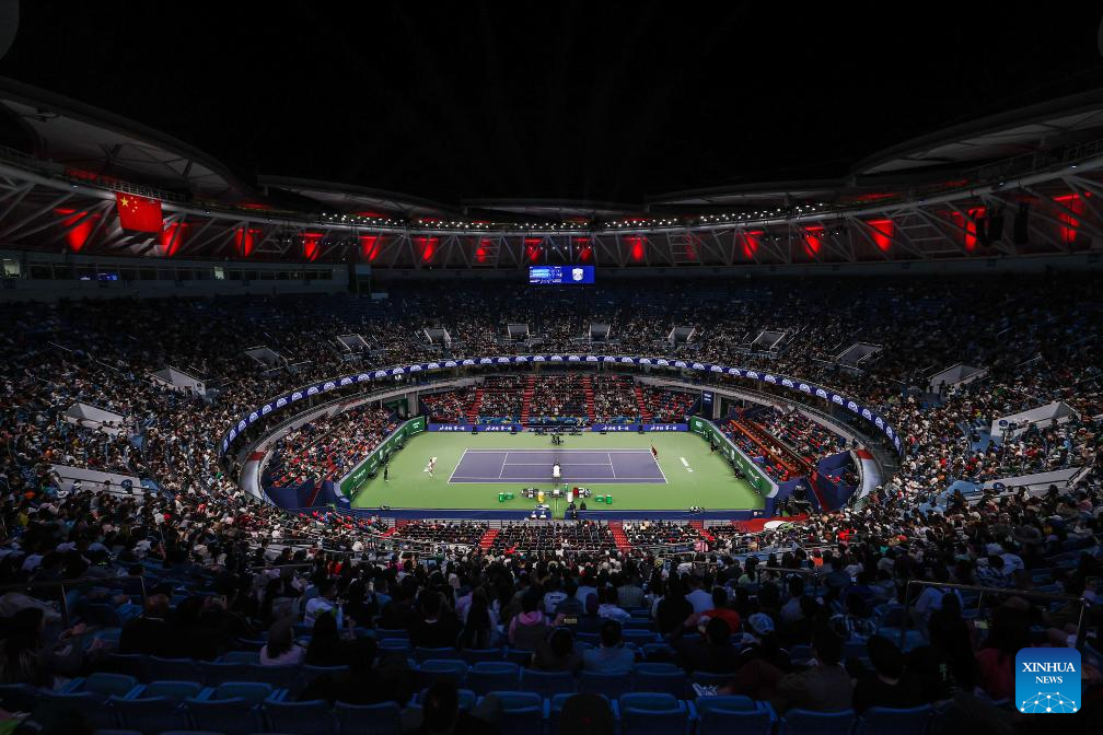 Novak Djokovic of Serbia and Flavio Cobolli of Italy compete during the men's singles round of 32 match at the ATP World Tour Shanghai Masters tennis tournament in Shanghai, east China, Oct. 8, 2024. (Xinhua/Bai Xuefei)
