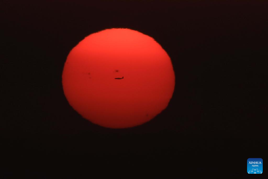 An aircraft flies against the backdrop of a setting sun in Amman, Jordan, Oct. 7, 2024. (Photo by Mohammad Abu Ghosh/Xinhua)
