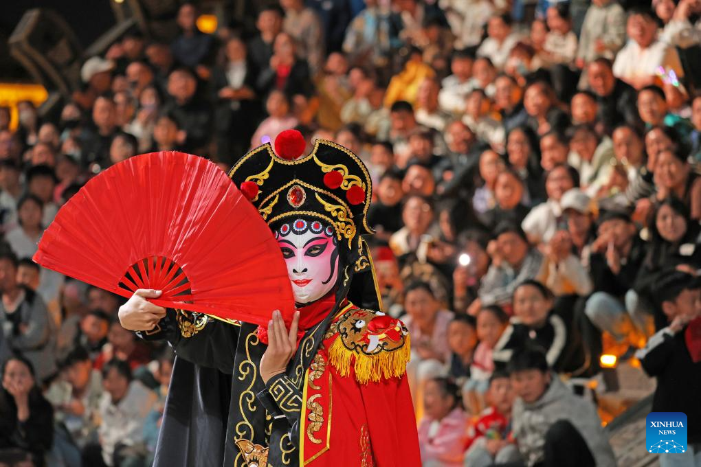 An actor performs face changing at the Tancheng ancient town scenic spot in Tancheng County in Linyi City, east China's Shandong Province, Oct. 1, 2024. (Photo by Zhang Chunlei/Xinhua)