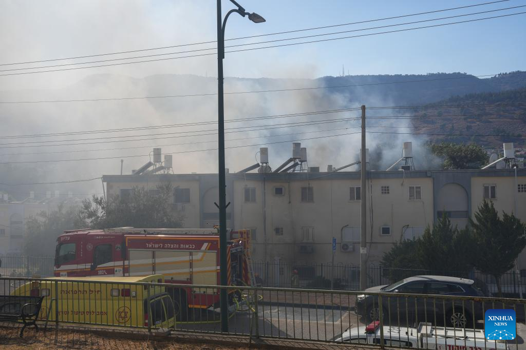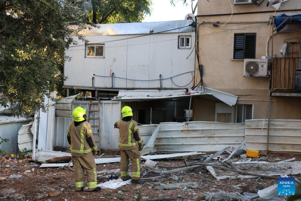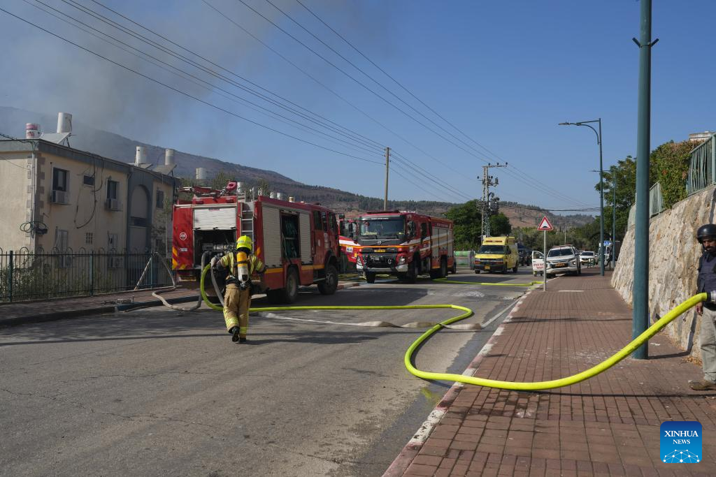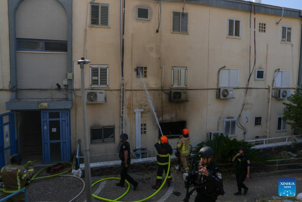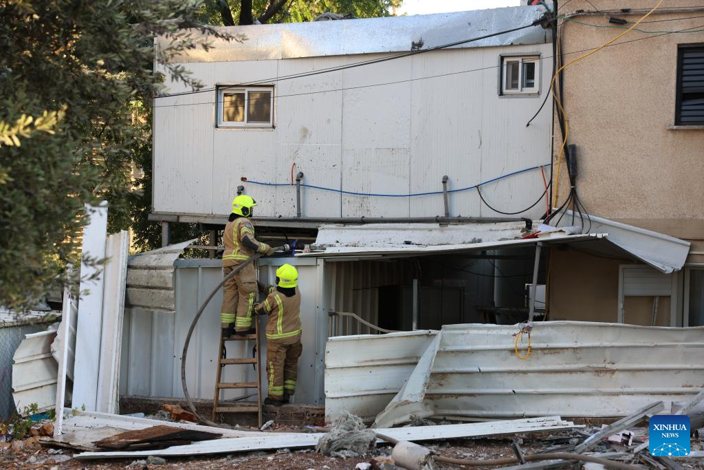 Firefighters work to put out a fire on a building hit during a Hezbollah's rocket attack in Kiryat Shmona, northern Israel, on Oct. 9, 2024. A rocket fired by Hezbollah fighters from Lebanon killed two Israeli civilians in northern Israel on Wednesday, Israeli authorities said. Magen David Adom emergency health service reported that the victims were killed when a rocket struck the northern city of Kiryat Shmona. (Ayal Margolin/JINI via Xinhua)