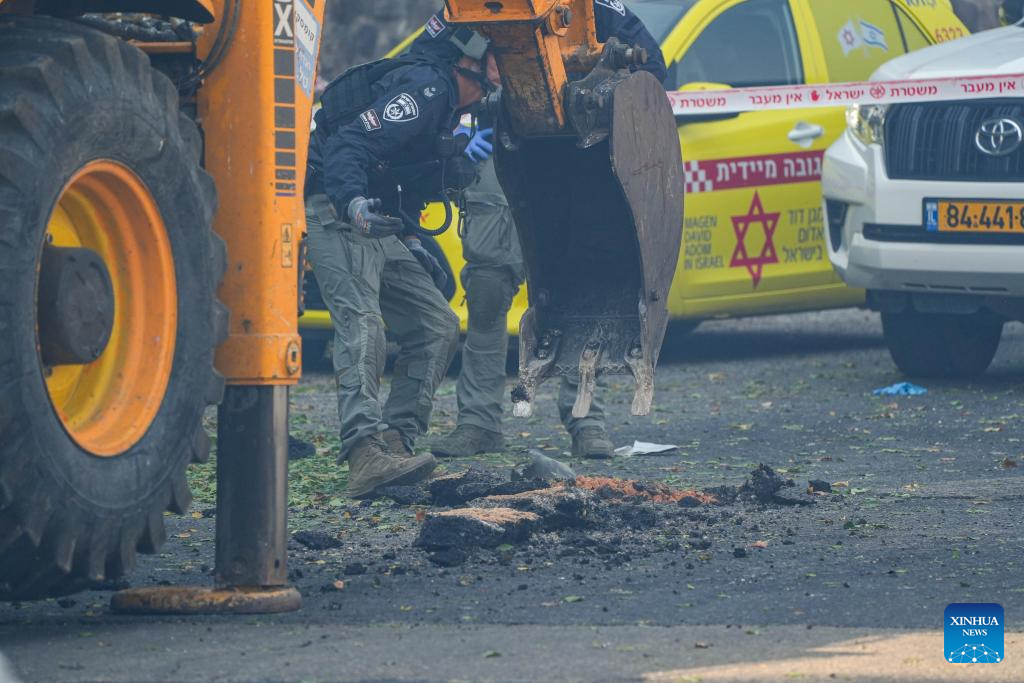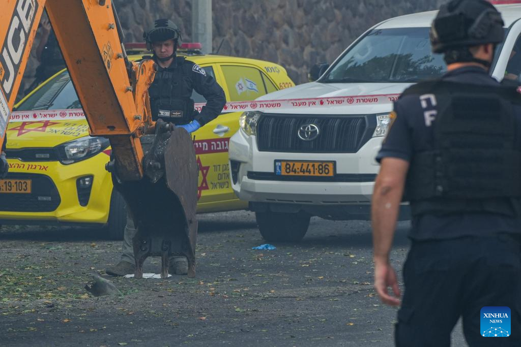 Members of Israeli security forces work at the scene of a Hezbollah's rocket attack in Kiryat Shmona, northern Israel, on Oct. 9, 2024. A rocket fired by Hezbollah fighters from Lebanon killed two Israeli civilians in northern Israel on Wednesday, Israeli authorities said. Magen David Adom emergency health service reported that the victims were killed when a rocket struck the northern city of Kiryat Shmona. (Ayal Margolin/JINI via Xinhua)