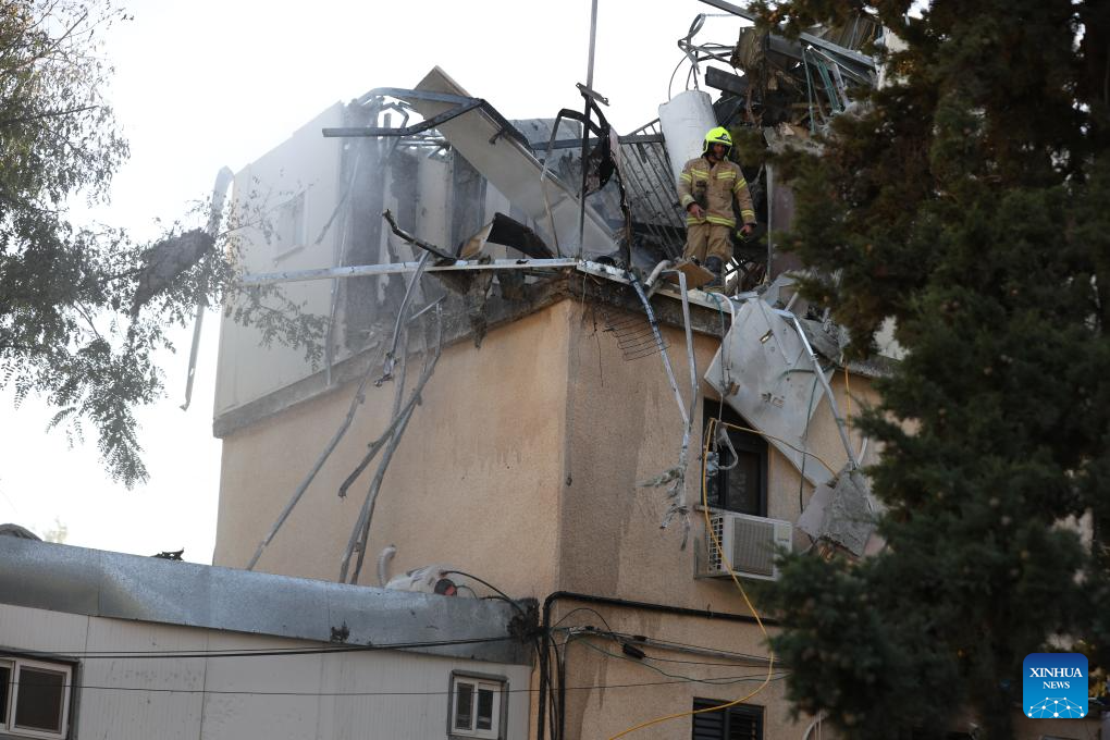 Members of Israeli emergency services work at a building hit during a Hezbollah's rocket attack in Safed, northern Israel, on Oct. 9, 2024. Earlier on Wednesday, militants in Lebanon fired around 40 rockets at northern Israel's Upper Galilee and Haifa Bay areas, injuring at least five people. The Israeli military stated that "some of the projectiles were intercepted by the Israeli Air Force, while others landed in the area." (David Cohen/JINI via Xinhua)