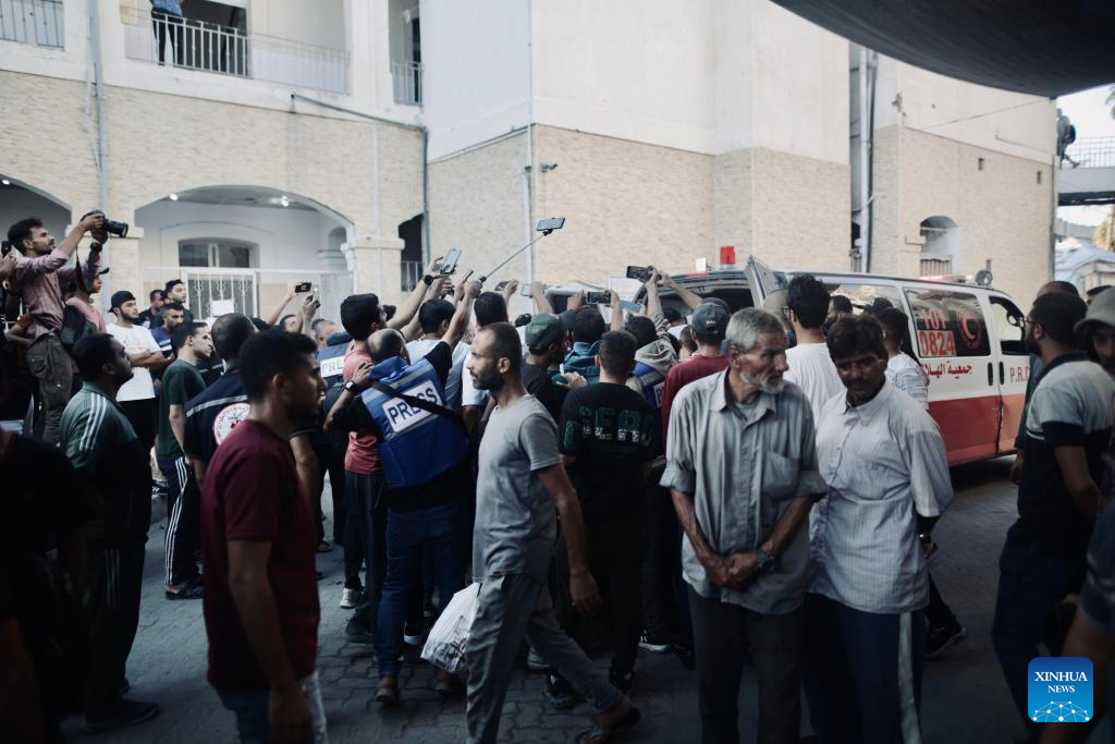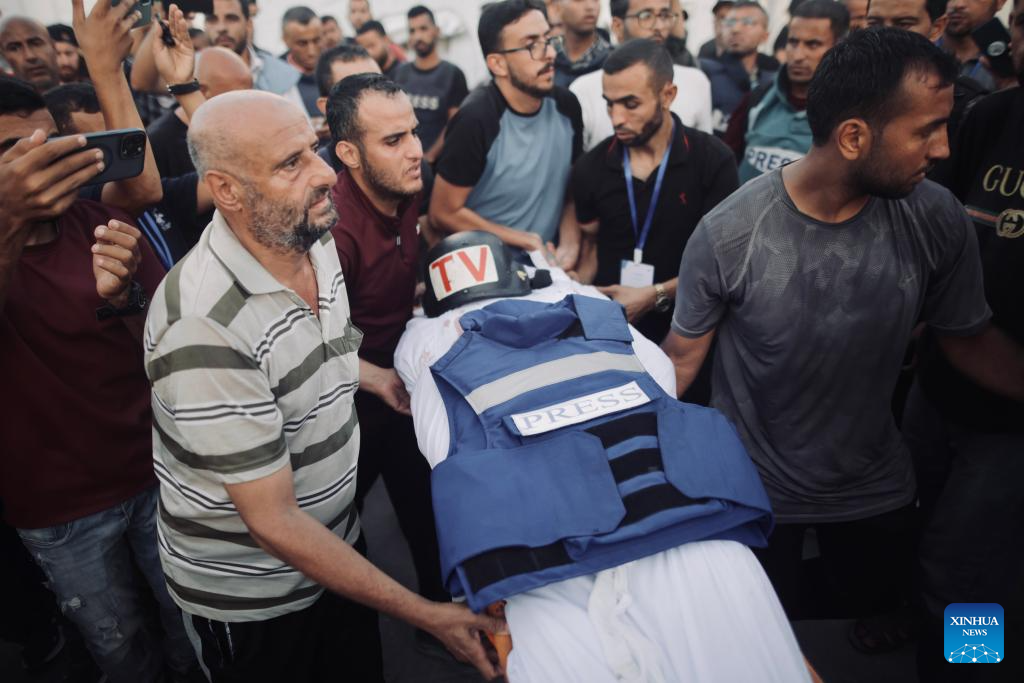 People gather around the remain of Mohammed al-Tanani, the cameraman of the Hamas-run al-Aqsa Satellite Channel, during his funeral in the northern Gaza Strip city of Jabalia, on Oct. 9, 2024. Palestinian medical sources reported that Israeli vehicles targeted the crew of the Hamas-run al-Aqsa Satellite Channel in the west of Jabalia camp, killing its cameraman, Mohammed al-Tanani, and critically wounding its reporter, Tamer Lobad. (Photo by Abdul Rahman Salama/Xinhua)