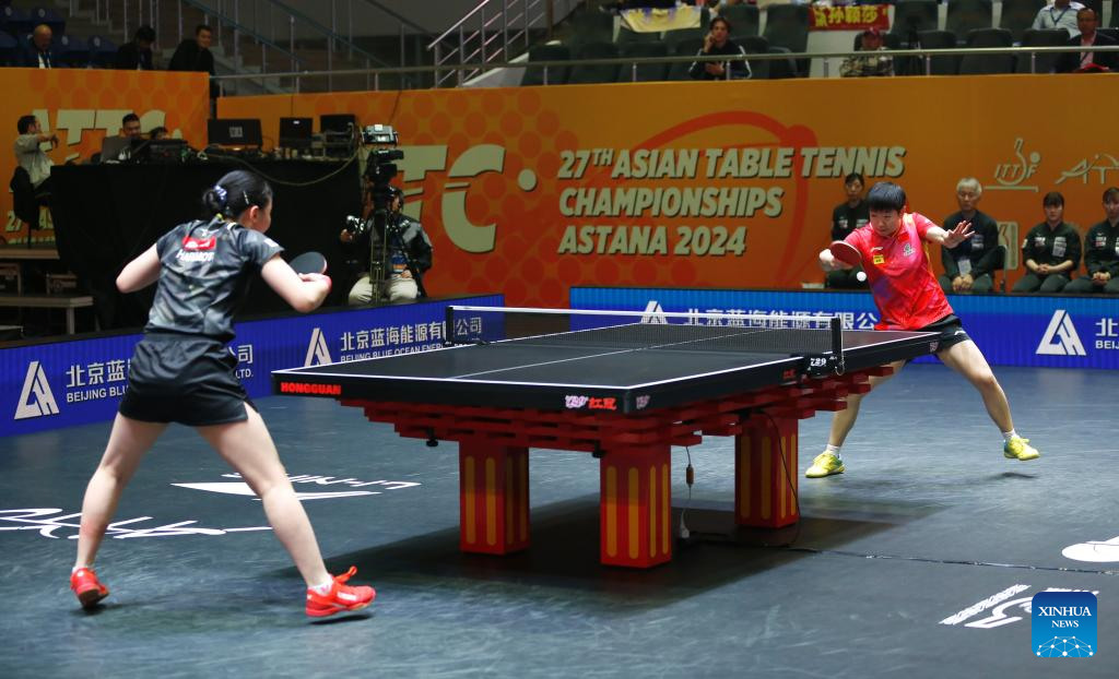 Sun Yingsha (R) of China competes against Harimoto Miwa of Japan during the women's teams final match between China and Japan at the 27th ITTF-Asian Table Tennis Championships in Astana, Kazakhstan, Oct. 9, 2024. (Photo by Kalizhan Ospanov/Xinhua)