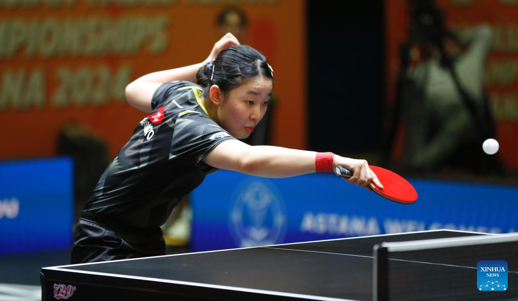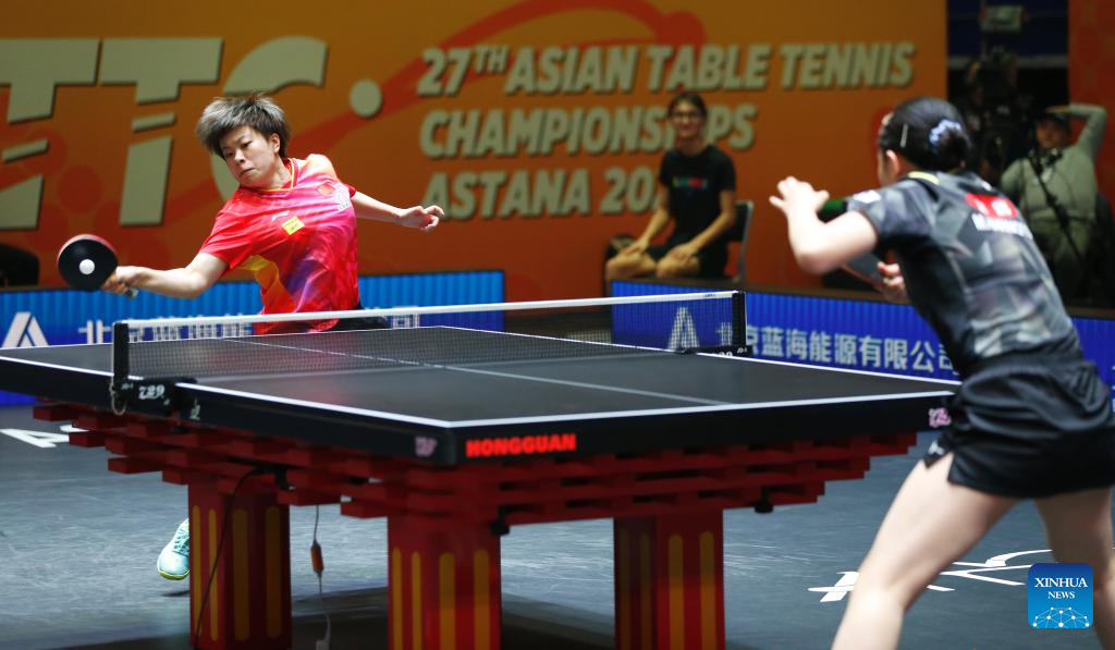 Chen Xingtong of China competes against Hirano Miu of Japan during the women's teams final match between China and Japan at the 27th ITTF-Asian Table Tennis Championships in Astana, Kazakhstan, Oct. 9, 2024. (Photo by Kalizhan Ospanov/Xinhua)