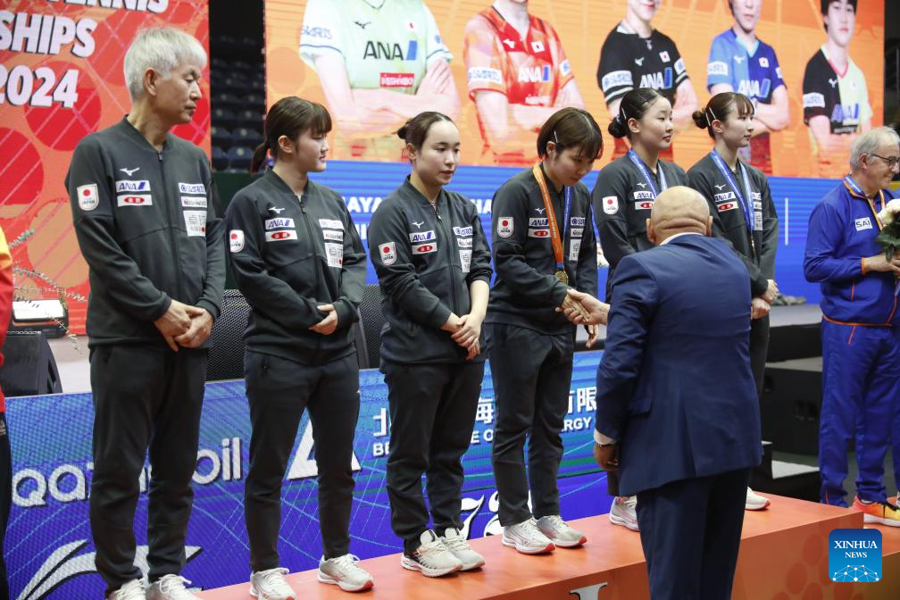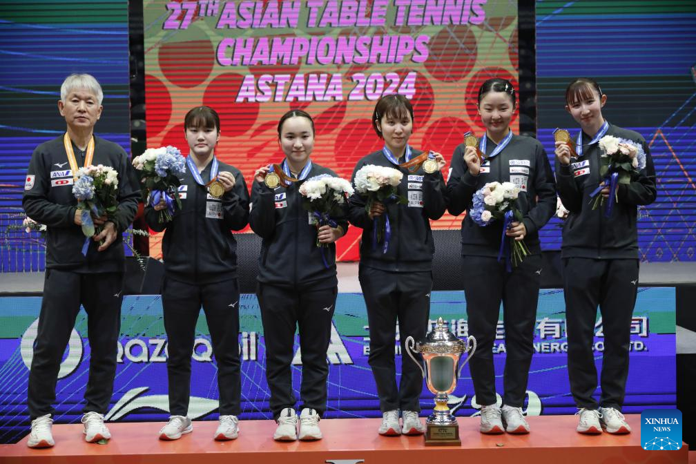 Team Japan attend the awarding ceremony after the women's teams final match between China and Japan at the 27th ITTF-Asian Table Tennis Championships in Astana, Kazakhstan, Oct. 9, 2024. (Photo by Kalizhan Ospanov/Xinhua)