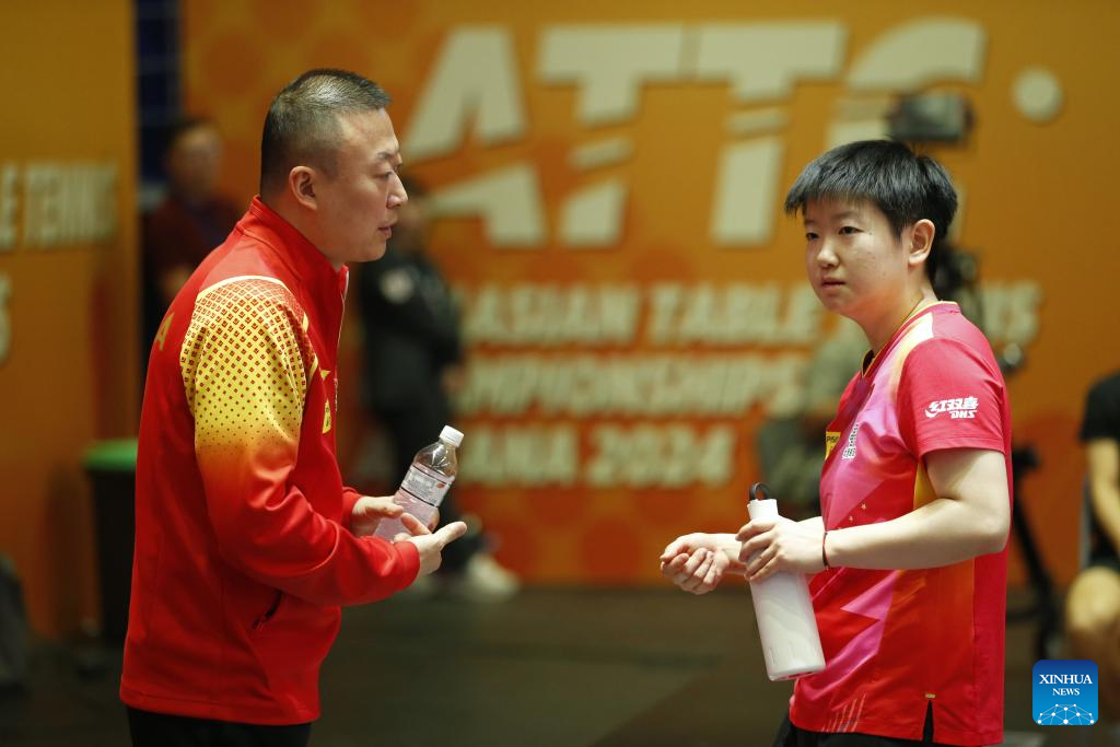 Sun Yingsha (R) of China communicates with head coach Ma Lin during the women's teams final match between China and Japan at the 27th ITTF-Asian Table Tennis Championships in Astana, Kazakhstan, Oct. 9, 2024. (Photo by Kalizhan Ospanov/Xinhua)