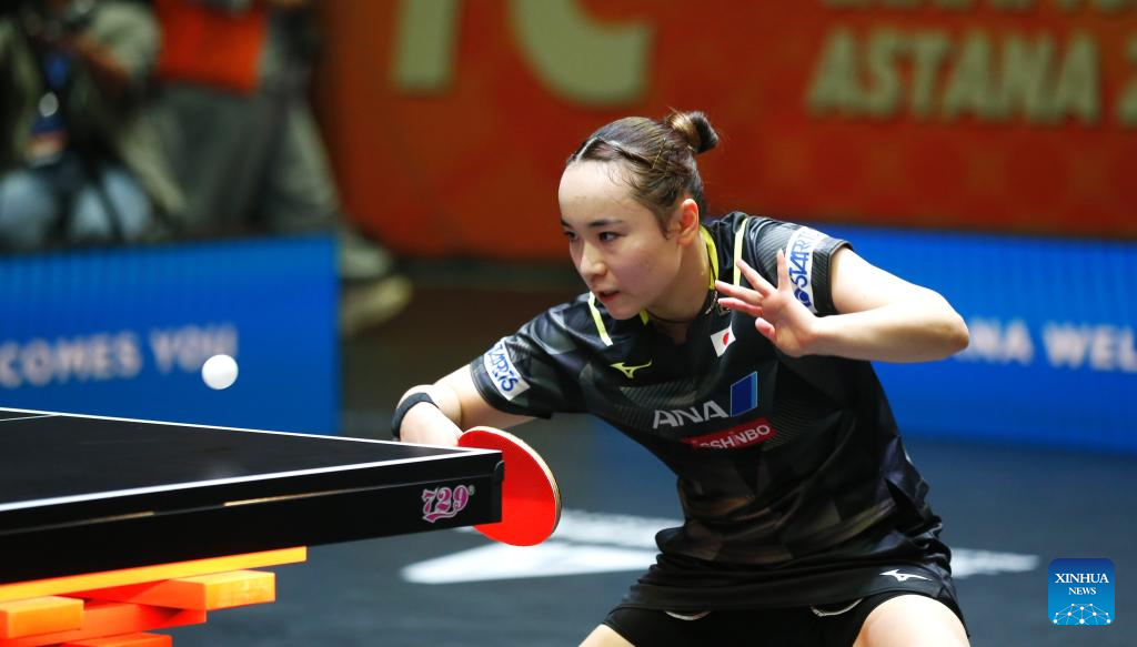 Ito Mima of Japan hits a return to Sun Yingsha of China during the women's teams final match between China and Japan at the 27th ITTF-Asian Table Tennis Championships in Astana, Kazakhstan, Oct. 9, 2024. (Photo by Kalizhan Ospanov/Xinhua)