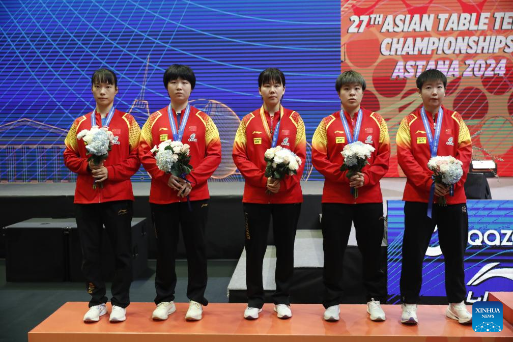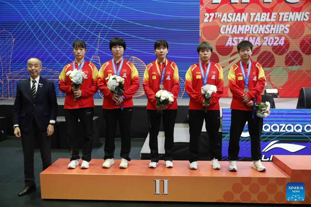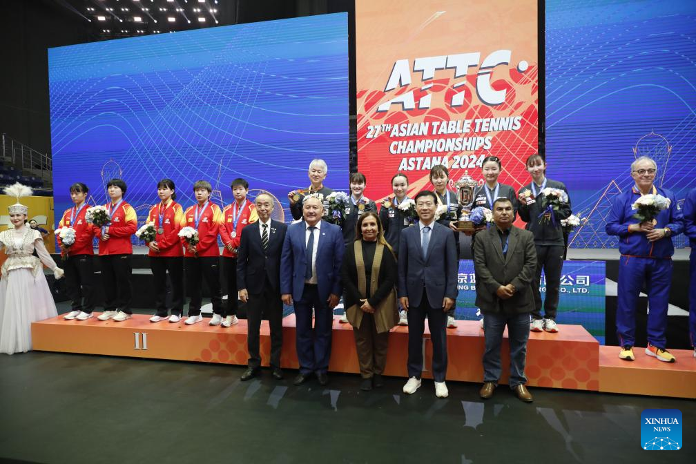 Team China attend the awarding ceremony after the women's teams final match between China and Japan at the 27th ITTF-Asian Table Tennis Championships in Astana, Kazakhstan, Oct. 9, 2024. (Photo by Kalizhan Ospanov/Xinhua)