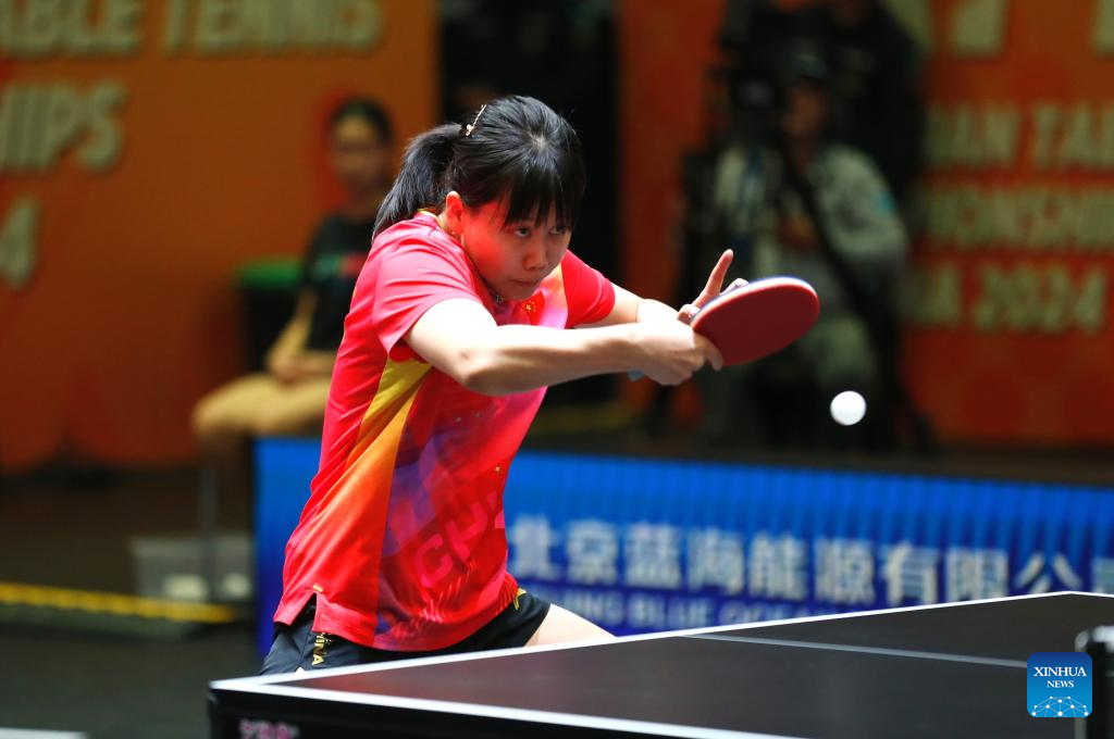 Sun Yingsha of China hits a return to Harimoto Miwa of Japan during the women's teams final match between China and Japan at the 27th ITTF-Asian Table Tennis Championships in Astana, Kazakhstan, Oct. 9, 2024. (Photo by Kalizhan Ospanov/Xinhua)