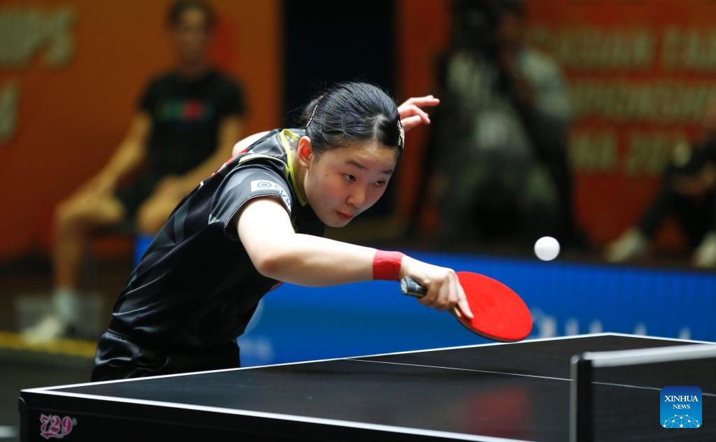 Hirano Miu of Japan hits a return to Chen Xingtong of China during the women's teams final match between China and Japan at the 27th ITTF-Asian Table Tennis Championships in Astana, Kazakhstan, Oct. 9, 2024. (Photo by Kalizhan Ospanov/Xinhua)