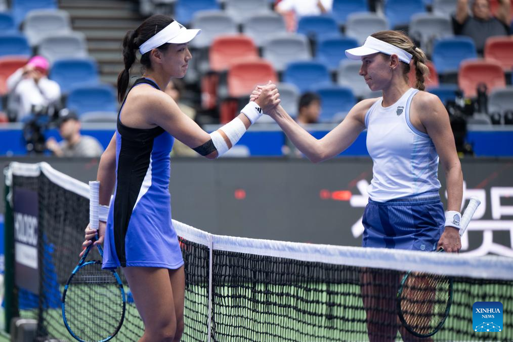 Wang Xinyu (L) greets Ekaterina Alexandrova after the women's singles quarterfinal between Wang Xinyu of China and Ekaterina Alexandrova of Russia at the 2024 Wuhan Open tennis tournament in Wuhan, capital of central China's Hubei Province, Oct. 11, 2024. (Xinhua/Xiao Yijiu)