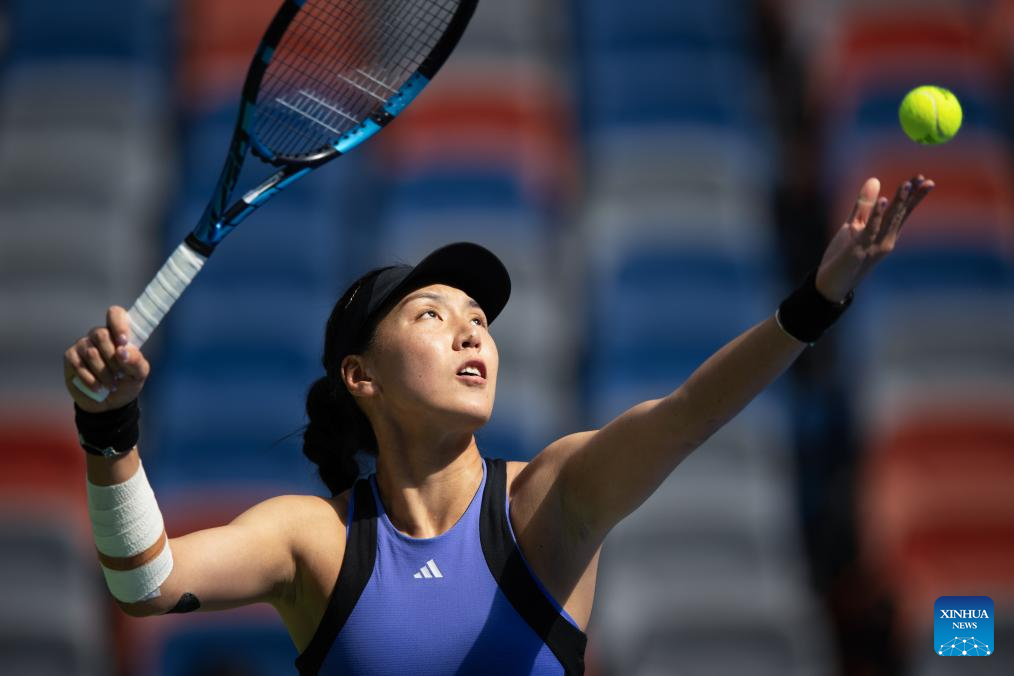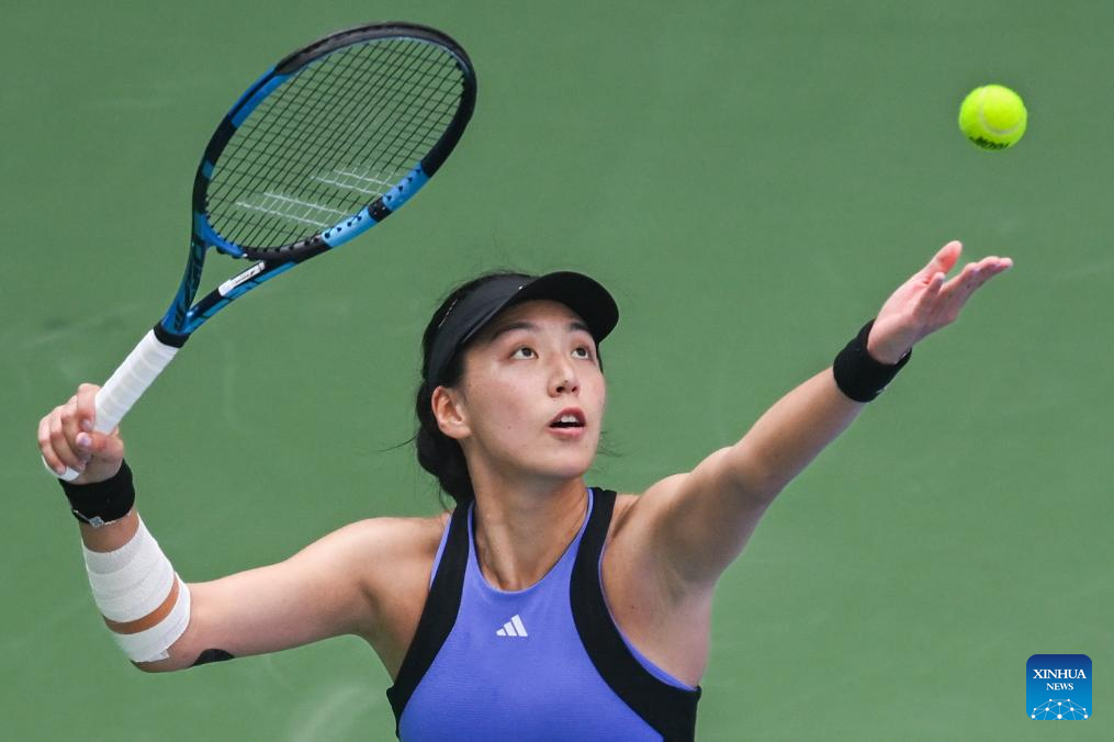 Wang Xinyu serves during the women's singles quarterfinal between Wang Xinyu of China and Ekaterina Alexandrova of Russia at the 2024 Wuhan Open tennis tournament in Wuhan, capital of central China's Hubei Province, Oct. 11, 2024. (Xinhua/Xiao Yijiu)