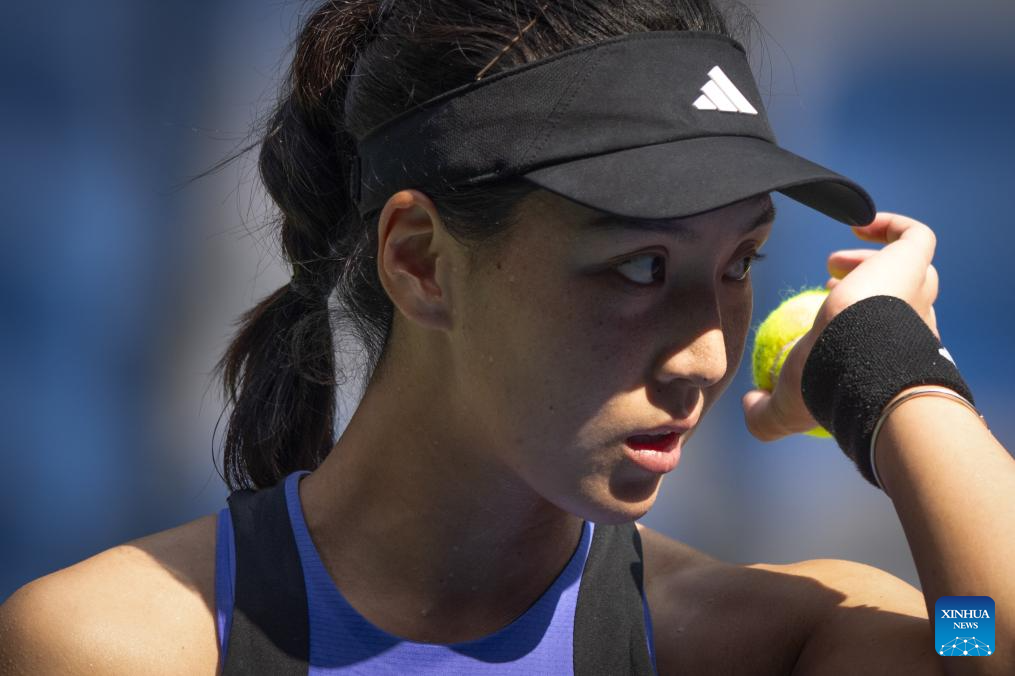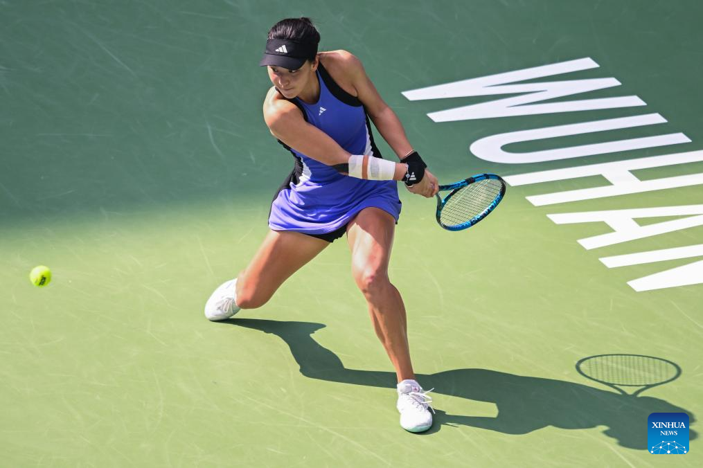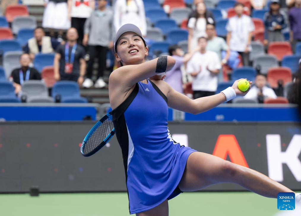Wang Xinyu hits a return during the women's singles quarterfinal between Wang Xinyu of China and Ekaterina Alexandrova of Russia at the 2024 Wuhan Open tennis tournament in Wuhan, capital of central China's Hubei Province, Oct. 11, 2024. (Xinhua/Du Zixuan)