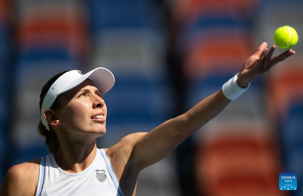 Ekaterina Alexandrova serves during the women's singles quarterfinal between Wang Xinyu of China and Ekaterina Alexandrova of Russia at the 2024 Wuhan Open tennis tournament in Wuhan, capital of central China's Hubei Province, Oct. 11, 2024. (Xinhua/Xiao Yijiu)