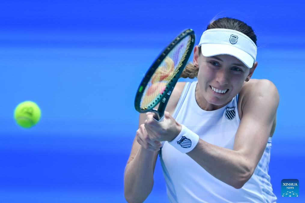 Ekaterina Alexandrova hits a return during the women's singles quarterfinal between Wang Xinyu of China and Ekaterina Alexandrova of Russia at the 2024 Wuhan Open tennis tournament in Wuhan, capital of central China's Hubei Province, Oct. 11, 2024. (Xinhua/Du Zixuan)