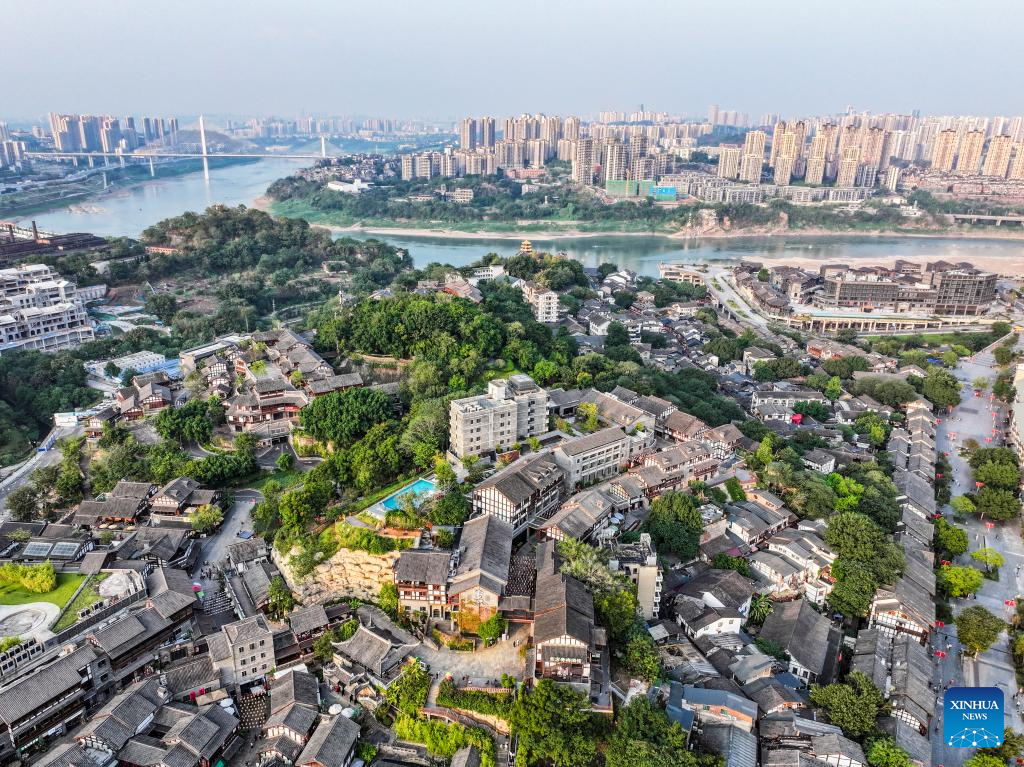 An aerial drone photo taken on Oct. 9, 2024 shows a view of the Ciqikou ancient town in southwest China's Chongqing Municipality. Located by the Jialing River in Chongqing, the ancient town of Ciqikou was first built in the Northern Song Dynasty (960-1127). In recent years, local authorities have advanced the integration of cultural and tourism development and the urban renewal, while preserving the authentic charm of the ancient town. (Xinhua/Wang Quanchao)