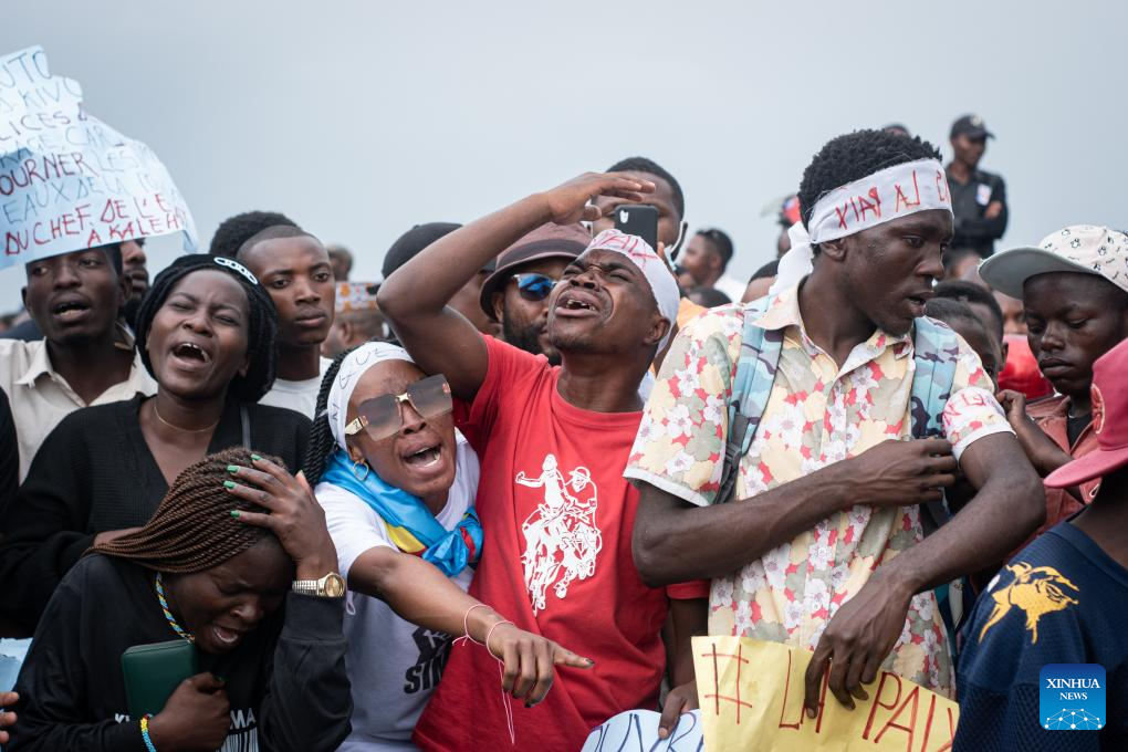 People mourn during a funeral for victims of a recent ferry accident in Goma, the capital of the North Kivu Province in the eastern Democratic Republic of the Congo (DRC), on Oct. 10, 2024. At least 87 people were killed last Thursday after the ferry capsized near the port of Kituku, according to a provincial government report that did not specify the number of people on board. (Photo by Zanem Nety Zaidi/Xinhua)