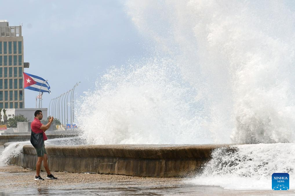 Huge waves are seen along a seaside road in Havana, Cuba, Oct. 9, 2024. Hurricane Milton brought intermittent rainfall to Cuba. (Photo by Joaquin Hernandez/Xinhua)