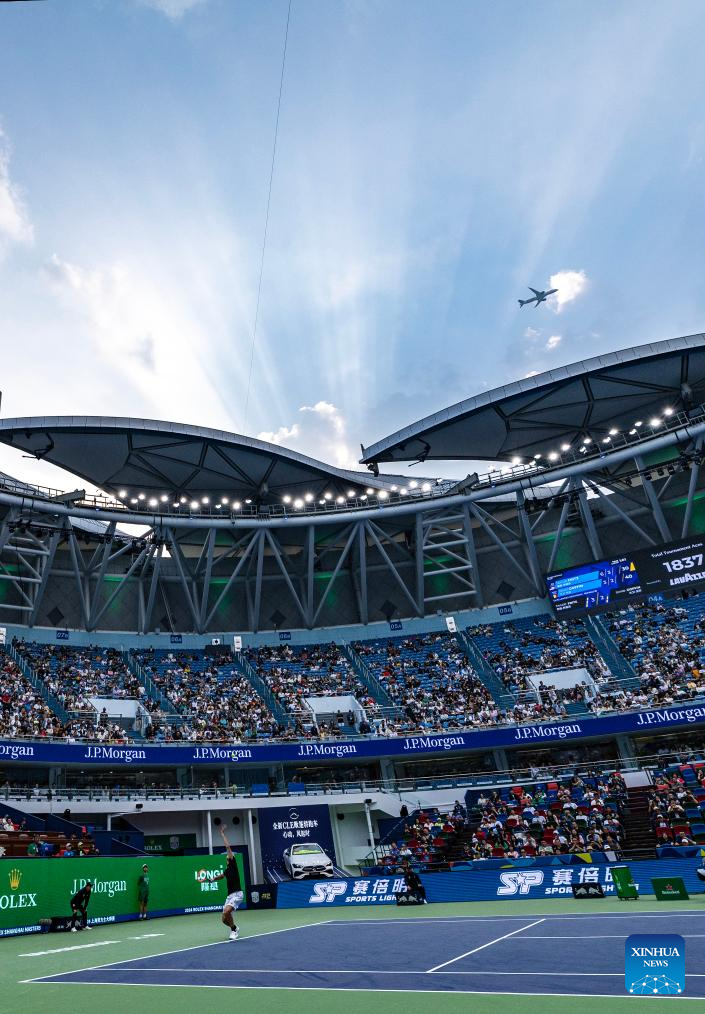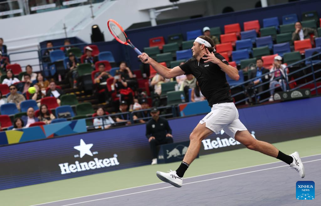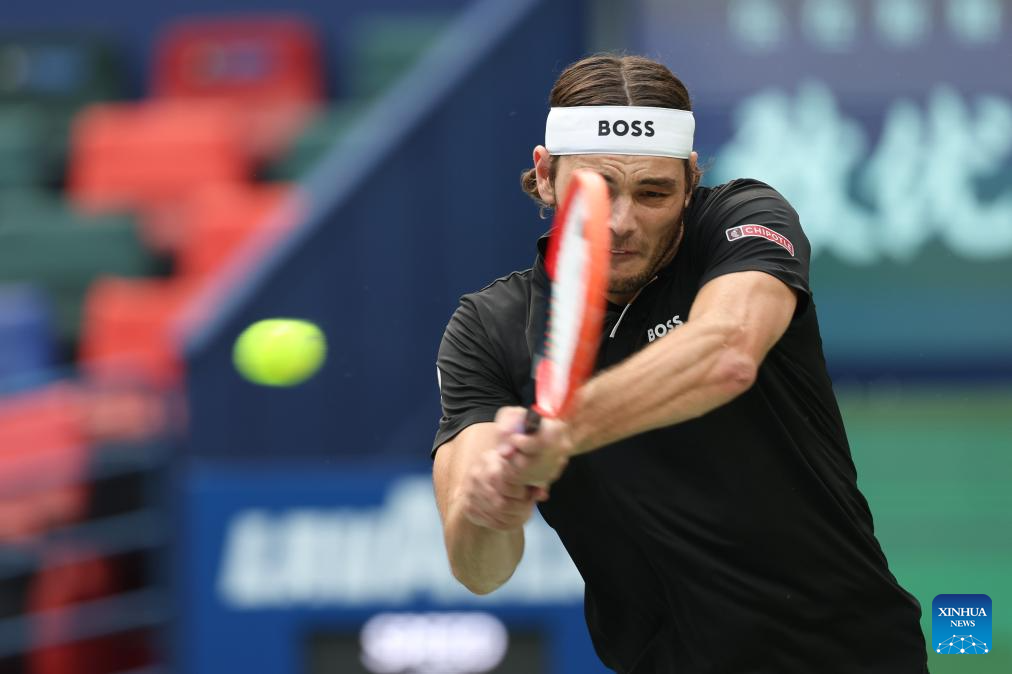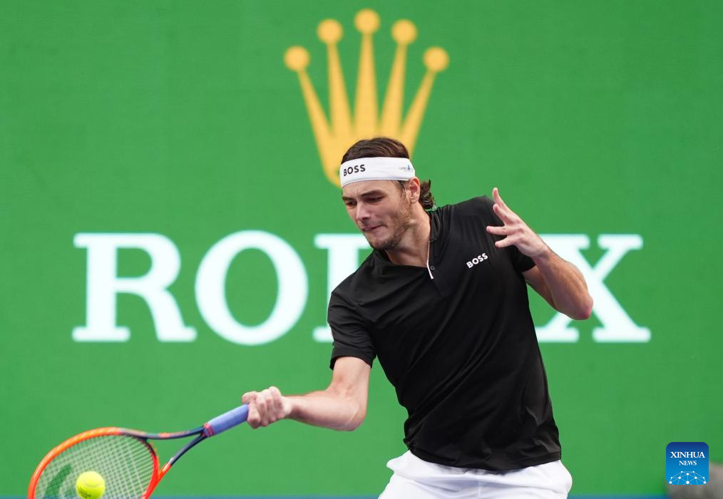 Taylor Fritz hits a return during the men's singles quarterfinal match between Taylor Fritz of the United States and David Goffin of Belgium at the ATP World Tour Shanghai Masters tennis tournament in Shanghai, east China, Oct. 11, 2024. (Xinhua/Xu Yanan)